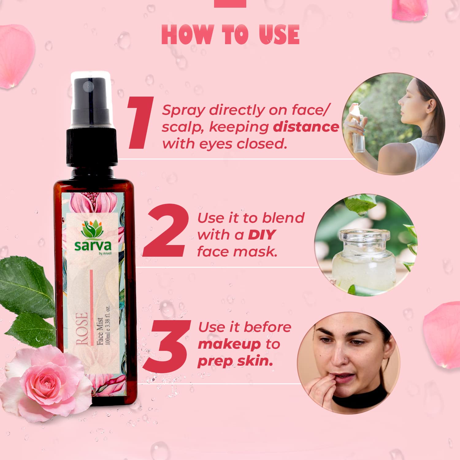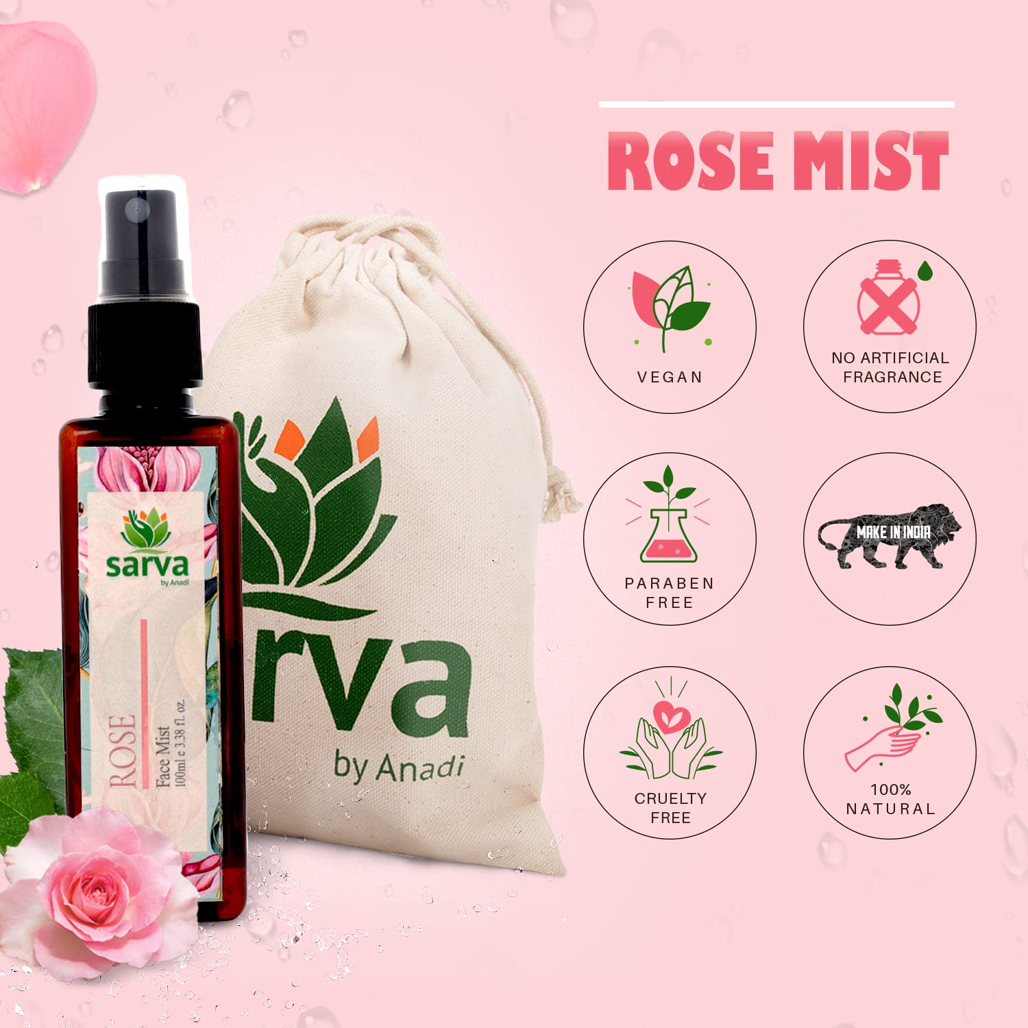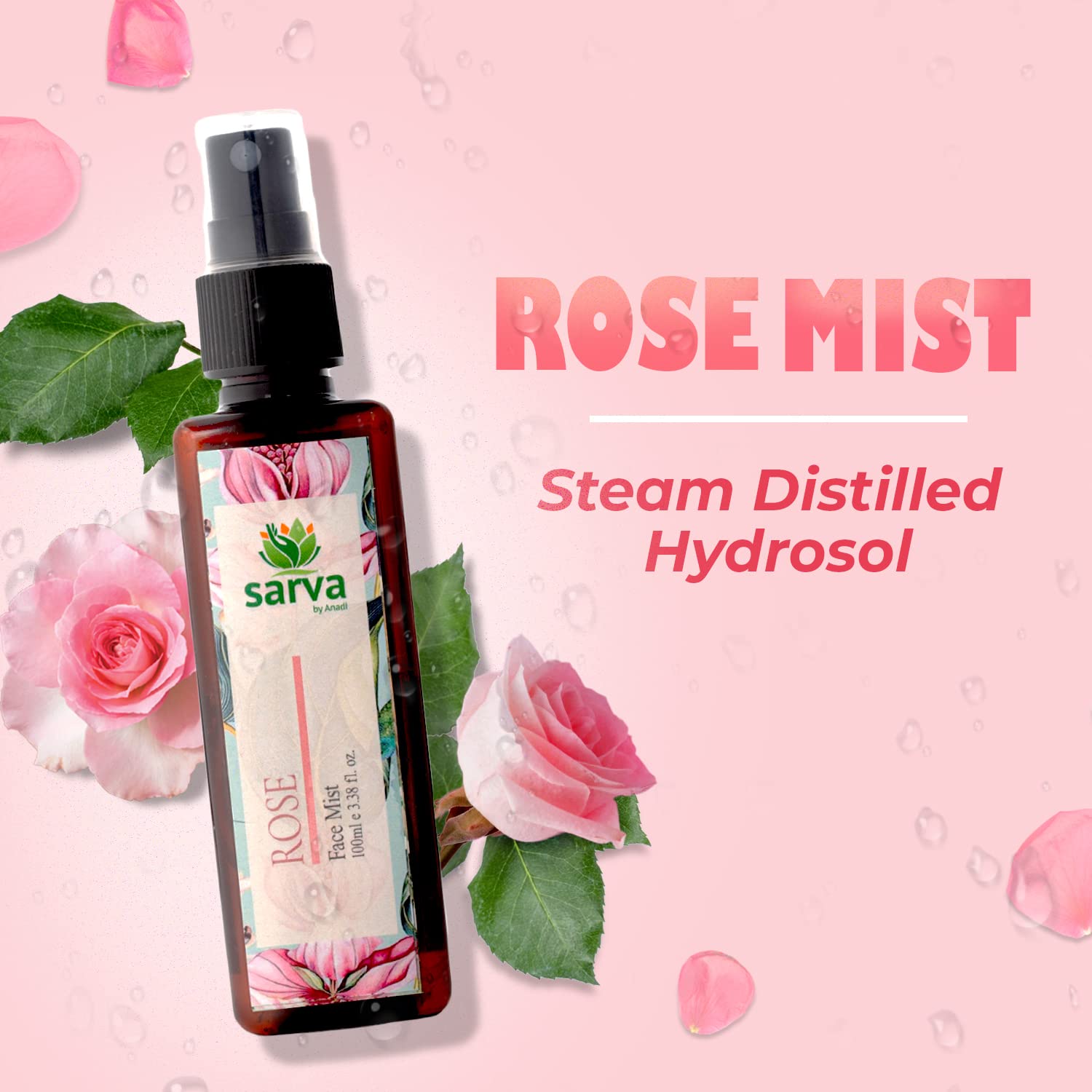 Rose Mist From Sarva By AnadiRose Mist Is Pure 100% Natural Steam Distilled Hydrosol Which Acts As A Mist And Toner To Your Face And Body. Rose Mist From Sarva By Anadi Is Created By Steam Distillation Of Petals Of Rosa Damascena.It Contains Numerous Powerful Antioxidants Which Can Help Protect Cells From Damage. Calming And Floral Aroma Acts As A Refreshing Toner Which Hydrates And Revitalizes Skin. This Soothing Water Improves Skin Texture Strengthens Skin Cells And Regenerates Skin Tissues. . Sarva by Anadi represents a collection of pure and natural products originated in India. Size: 100ml e 3.38 fl. OzRose Face Mist Caters To Host Of Amazing BenefitsActs As A Skin Toner Maintaining Ph Balance Make Up Remover Acne Fighter And Pore Cleanser.It Is An Anti-inflammatory And Helps To Reduce Redness In The Skin.It Has Antiseptic And Antibacterial Properties Which Helps Wounds Heal Faster By Keeping Them Clean And Fighting Injections.It Has Antidepressant And Anti-anxiety Properties.It Has Anti-ageing Properties Thus Helps To Reduce/Prevent Wrinkles Blackheads And Whiteheads. 6. Best Suited For All Skin Types And Is A Unisex Product.Directions For Use Spray Directly On Face/Body Keeping A Slight Distance With Eyes Closed.There Is No Need To Dilute The Hydrosols.Keep Your Rose Hydrosol Refrigerated For Enhanced Soothing And Refreshing Effect.Use It To Blend With A DIY Face MaskSerums and Moisturizers.Add It To Your Bathwater To Promote Softer Renewed Skin and For A Relaxing Aromatherapy Session.ForewarningFor External Use Only. Avoid Contact With Eye.Keep Away From Children Under 3 Years.Do A Patch Test On Skin First. User Discretion Required.