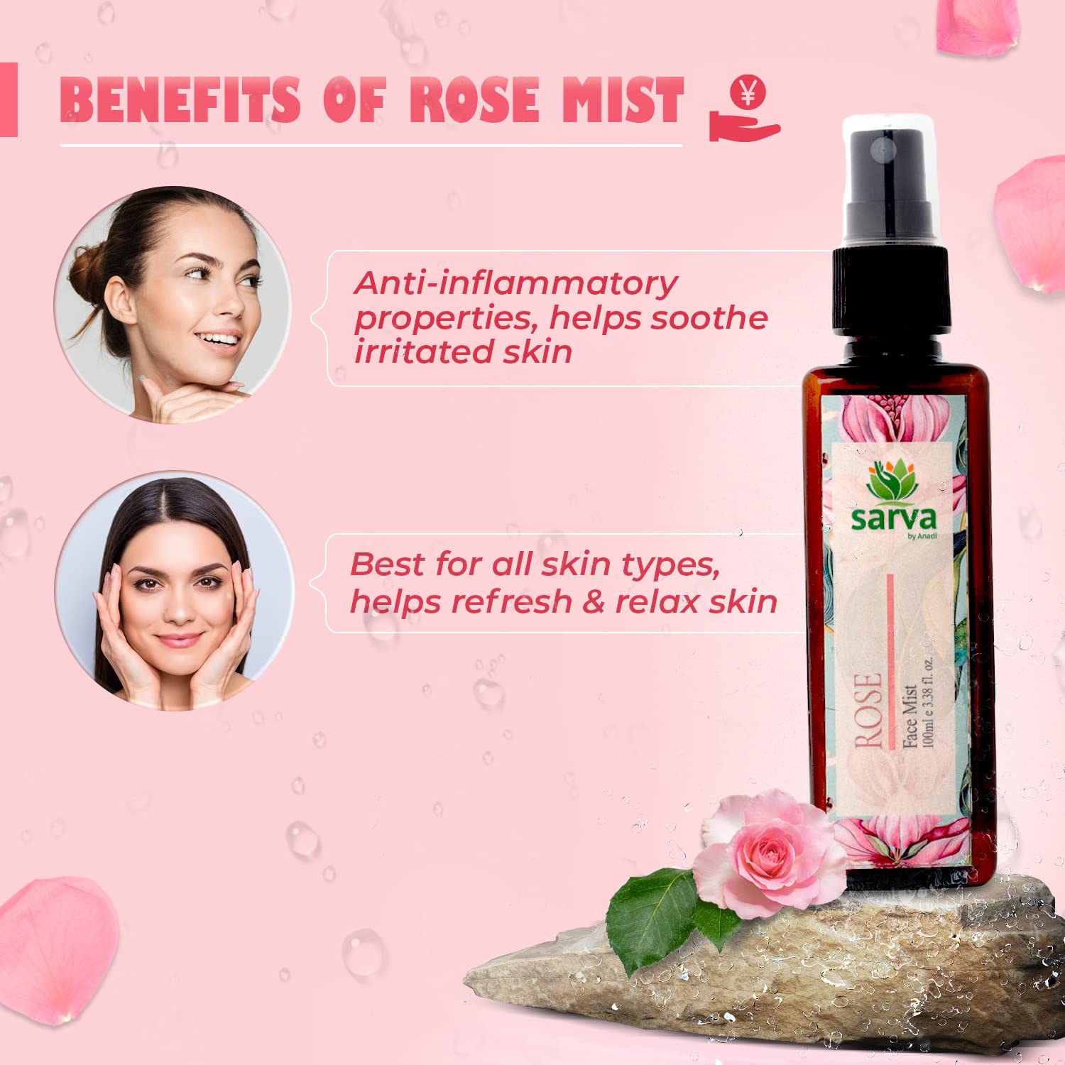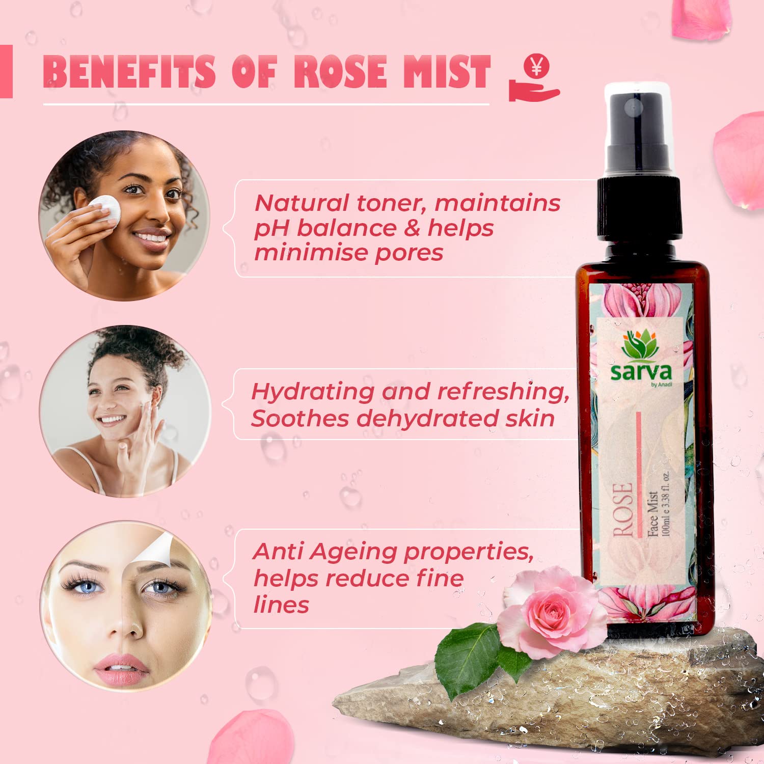 SARVA by Anadi 100% Pure Natural Undiluted Rose Face Mist/Rose Water/Gulab Jal Steam DistilledSkin Toner For All Types Of Skin No Alcohol & No Artificial Fragrances (100 Ml)