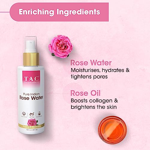 T.A.C Pure Indian Rose Water For for Hydration & Glowing Skin, Alcohol Free, 100% Ayurvedic for Women & Men, All Skin Types, 100ml