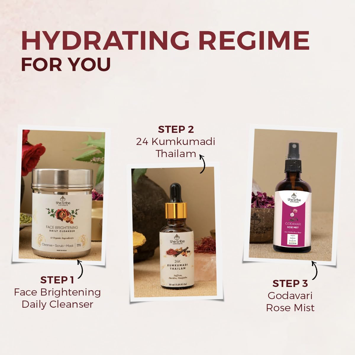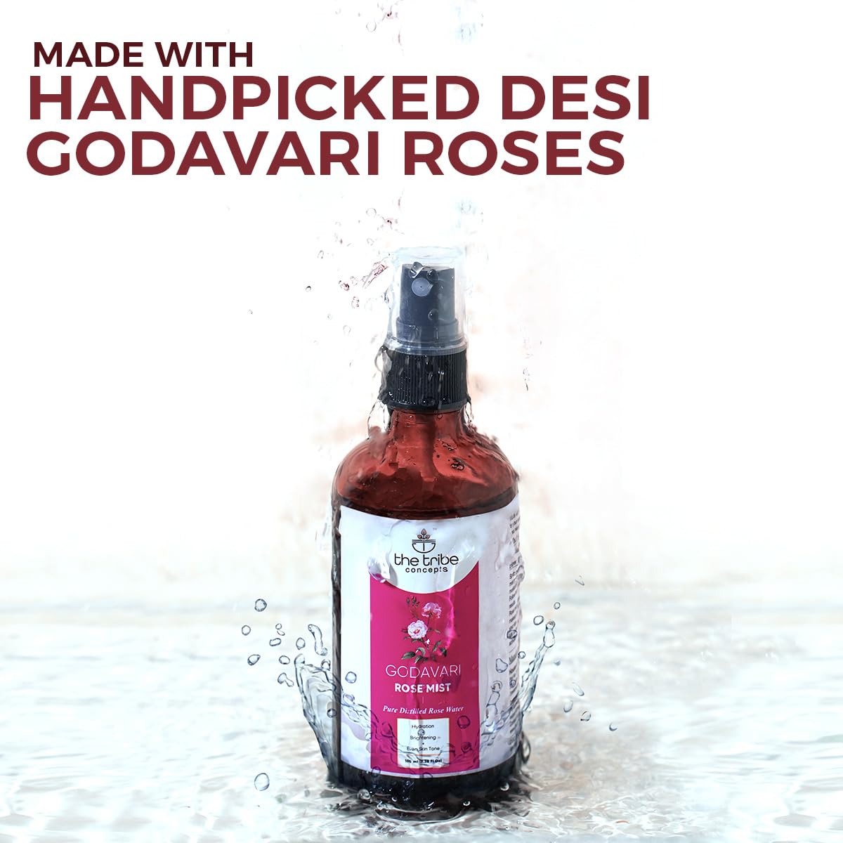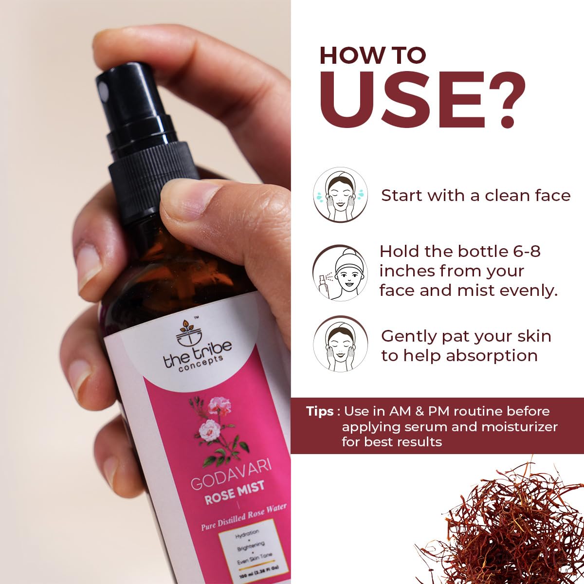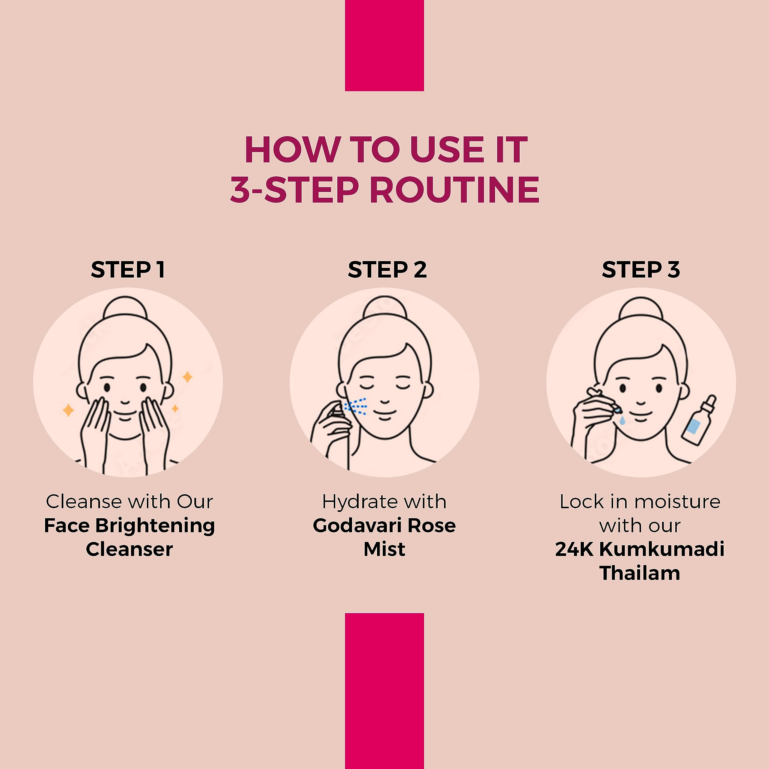 Godavari Rose Mist Face Toner which is enriched with Ingredients: Handpicked Desi Godavari Roses suits All skin Type and you can use Directions: Step1: Cleanse with our Face Brightening Cleanser; Step2: Hydrate with Godavari Rose Mist; Step3: Lock in moisture with our 24k Kumkumadi Thailam. Unlock the secret to radiant healthy skin with our Rose Face Toner. Crafted with care and infused with the pure essence of natural roses this toner is your ticket to a refreshed revitalized complexion. Travel-Ready: Packaged in a sleek and convenient spray bottle our toner is your perfect travel companion for maintaining your skincare routine on the go.