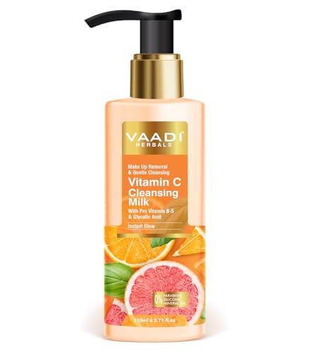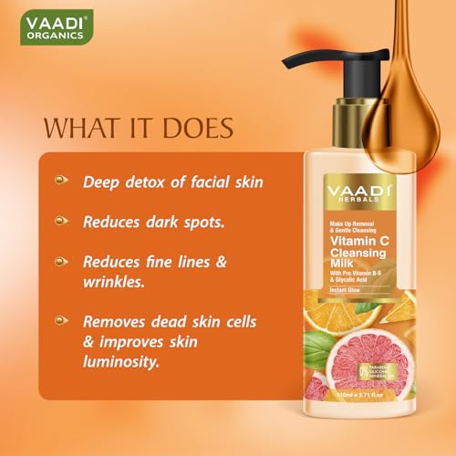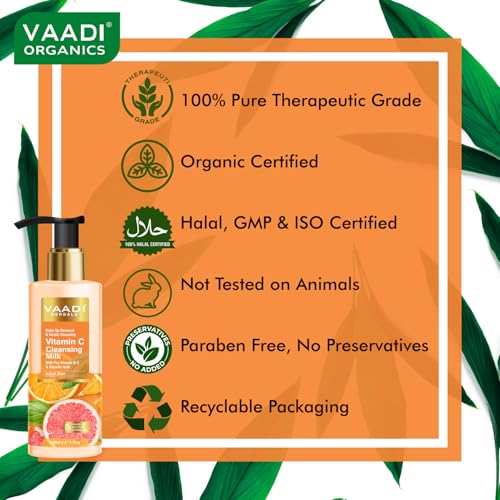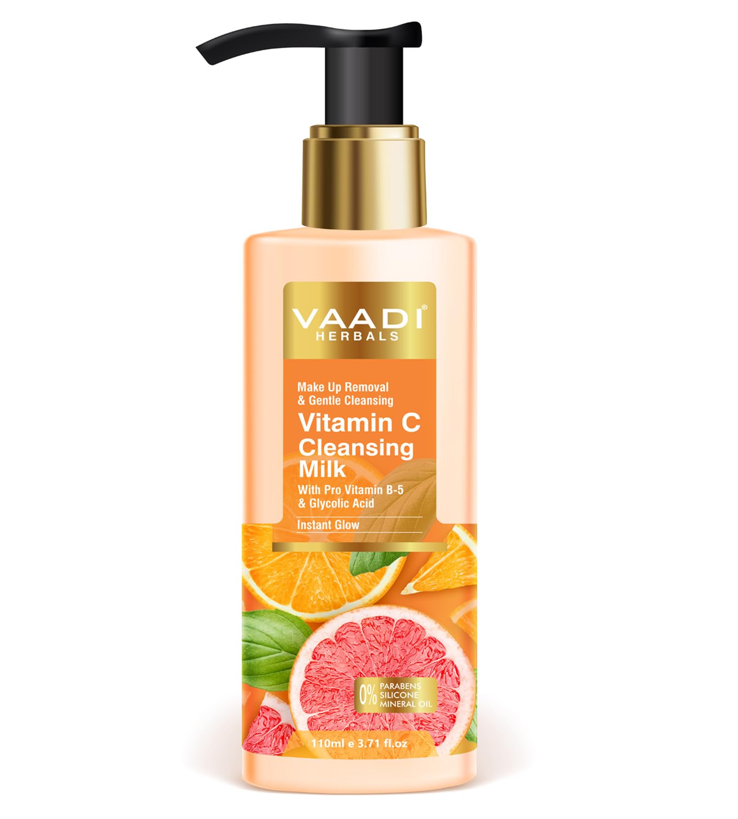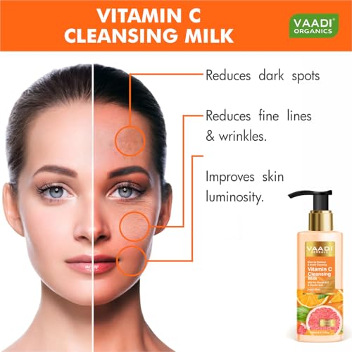 This Vitamin C based cleansing milk is an excellent formulation to make skin radiant and dirt free. It is a sulfate-free facial cleanser that helps clarify skin and removes excess oil and impurities. Its natural Vitamin C content owing to steam distilled Orange Peel and Lemon Extract help clear away dullness in skin due to ageing and exposure to pollution and boost radiance with this skin-brightening pH-balanced facial cleanser. The presence D Panthenol and Glycolic acid in this formulation leaves skin healthy glowing and more youthful in appearance. This cleansing milk is deal for skin showing signs of uneven pigmentation discoloration skin damaged due to exposure to sun and pollution freckles age spots and dark spots. Toning is the second step in a skincare regimen and proves to be highly beneficial in improving the texture of skin. Combining Vitamin C with Niacinamide in this unique toner helps remove impurities and excess oil from the face. Toner helps tighten and cleanse pores from within while also preventing the skin from acne and outbreaks. Vaadi Herbals Vitamin C toner is supremely hydrating and is packed with the benefits of Orange Peel extract Witch Hazel Niacinamide and essential oils. The vitamin C in this toner promotes the formation of healthy collagen which brightens the complexion and helps firm the skin. Witch hazel soothes acne-prone sensitive skin by reducing inflammation. Vaadi Herbals Vitamin C Face Toner is ideal for all skin types. Vitamin C is widely regarded as one of the most effective anti-aging substances available as well as the essential in keeping a smooth even and glowing complexion. Its hydration brightens the skin and minimizes redness and hyperpigmentation as well as the appearance of under-eye circles.