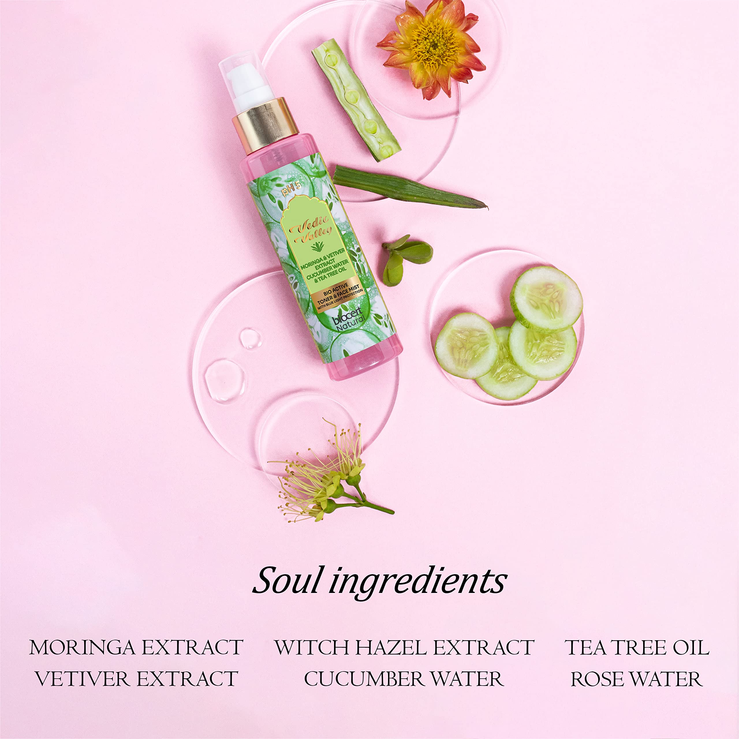 KEY INGREDIENTS - Pomegranate Enzyme Moringa Extract Vetiver Extract Witch Hazel Extract Organic Orange Bom Floral Water Cucumber Water Tea Tree Oil Rose Water Tropaeolum majus