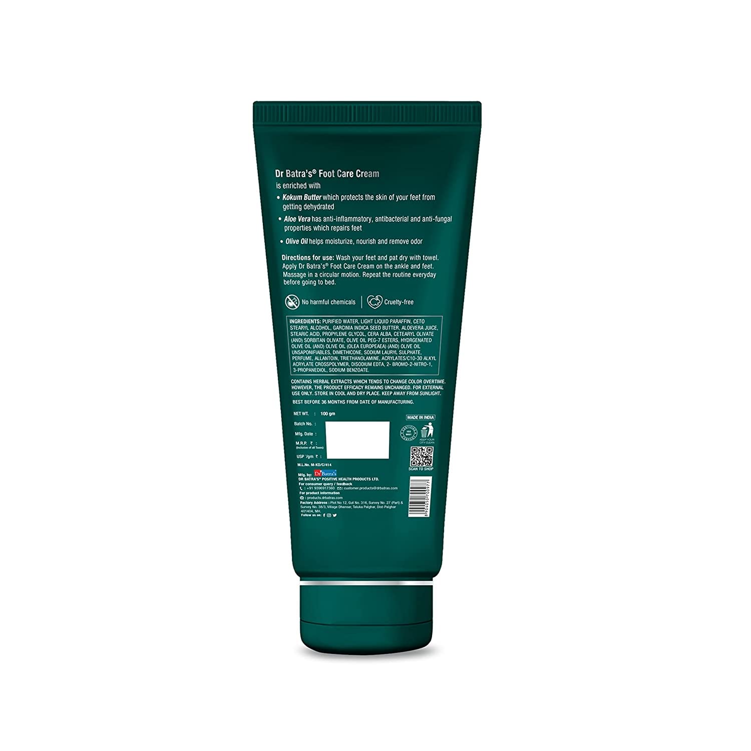 Dr Batra's Foot Care Cream Enriched With Kokum Butter Olive Oil & Echinacea Purpurea Formulated with naturals SLS & Paraben free Cream for smooth & supple skin (100g)