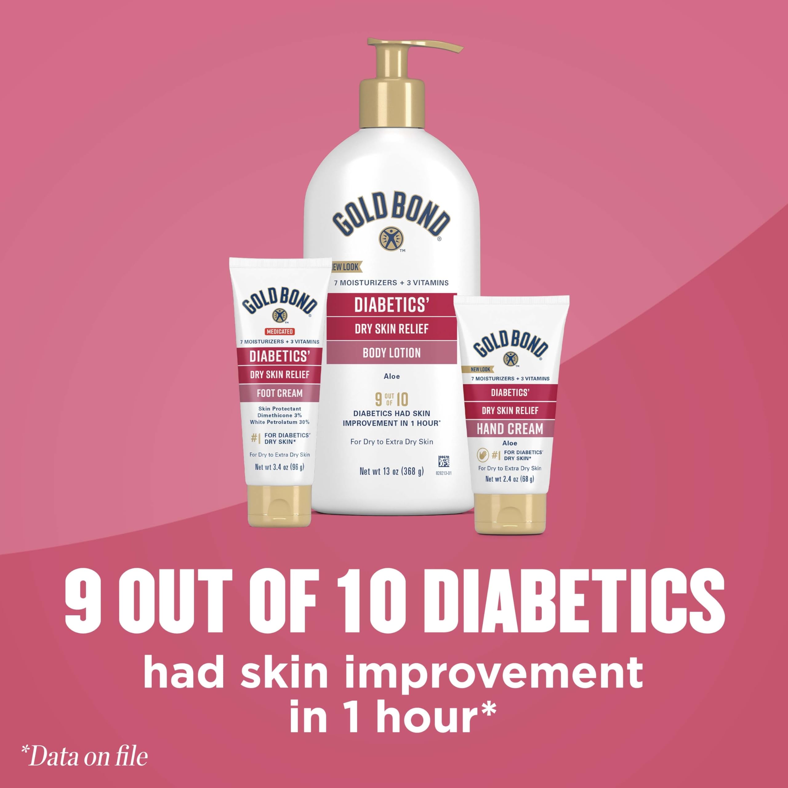 Diabetics' skin can become dry rough and generally uncomfortable especially on feet. Get soothing relief for rough dry skin and heels with Gold Bond Ultimate Diabetics' Dry Skin Relief Foot Cream the #1 lotion brand for diabetics dry skin*. Specially formulated for diabetics' dry skin this foot cream goes to work quickly to moisturize and hydrate feet. It contains seven intensive moisturizers and aloe to hydrate and soothe tough foot skin. In fact nine out of 10 people with diabetes saw noticeable skin improvement within one hour* of using Gold Bond Foot Cream for Diabetics' Skin. This foot cream not only adds a layer of moisture to skin that lasts for 24 hours but it's also dermatologist-tested hypoallergenic and fragrance-free. Best of all it doesn't contain harsh alpha hydroxy acids which can irritate skin. Give your feet the soothing moisture they deserve. Stock up on 3.4-oz. bottles of Gold Bond Ultimate Diabetics' Dry Skin Relief Foot Cream. *Nielsen xAOC L52 Hand and Body Lotion WE 7.11.20