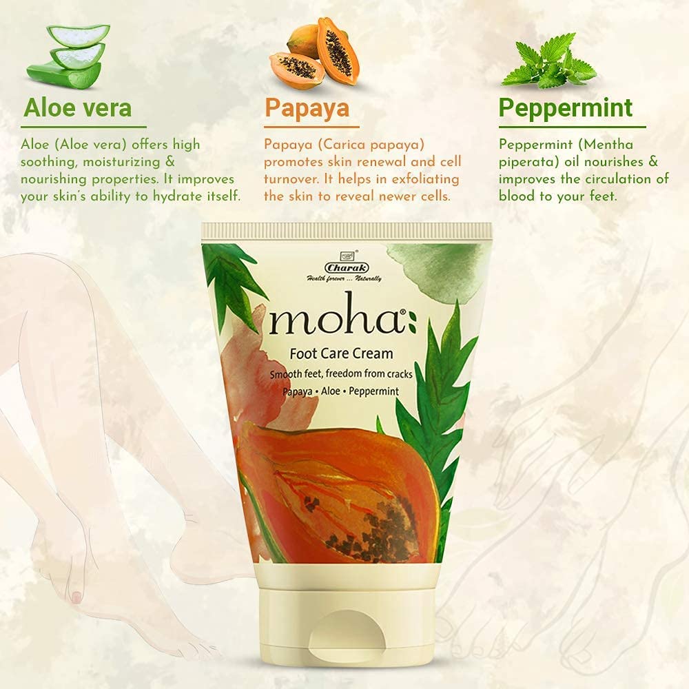 Rich luxurious and soothing foot care cream enriched with the goodness of Papaya Peppermint and Aloe Vera for smooth and beautiful feet moha: Foot Care Cream a quality product from Charak Pharma having 70 years of Ayurveda expertise combines proven ingredients like Papaya Aloe & Peppermint to smoother soften and nourish your feet.