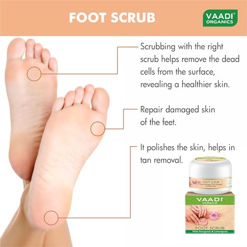 This uniquely designed foot scrub scientifically uses precious herbs and scrubs to effectively exfoliate dead foot tissues and rejuvenates the rough and damaged foot skin. Makes your feet super soft and supple. Why do our feet need scrubbing?Our skin follows a renewal cycle. New cells get produced in the inner layers; and travel to the surface while dying slowly. The resultant dead cells on the surface slough off maintaining the freshness of the skin. However with age this cycle gets disrupted. New cells grow slowly and dead cells slough off slowly. This causes accumulation of dead cells on the surface; making the skin look dull and unhealthy. On the other hand slower cellular renewal rate means hampered reparability of the skin. Scrubbing with the right products takes care of both these issues. It helps remove the dead cells from the surface revealing a healthier skin. And it stimulates production of new cells which keeps the skin looking healthy; helps maintain the elasticity and firmness; and even in repairing damaged skin of the feet.What benefits does Fenugreek render to this formulation?Fenugreek is known to exhibit anti-inflammatory action. Thus it helps greatly in reducing pain and swelling and relaxing tired feet. It is also known to treat sun-burn boils and other skin problems. It protects the skin against UV-induced damage too. Fenugreek or methi is also an excellent skin rejuvenator. Its property of a natural emollient keeps the feet soft supple and well-moisturized. Also being a rich source of Vitamin C it is granted anti-oxidant bleaching and toner properties. It fights signs of premature aging as well as lightens the skin tone and fades blemishes. It also deep cleanses the skin; removes dead skin cells; flushes out toxins; tightens pores and makes the skin glow.How do Jojoba Seed Grains prove useful for the scrub?Jojoba seed grains unlike other natural exfoliants are more uniform in shape and size. As such they happen to be less irritating to the skin in comparison. They gently unclog the skin pores by softening the blockage. They help in clearing the pores off impurities as well as removing dead skin cells from the surface without being harsh on the skin. This helps in reduction of dry flaky patches; and evening of the skin tone; while revealing a smoother and brighter skin. How effective is Lemongrass Oil in caring for the feet?Anti-septic anti-bacterial and anti-fungal properties of lemongrass oil help in treating as well as preventing foot infections; including athletes foot. And its analgesic action helps reduce inflammation as well as pain; thus soothing and easing over-worked feet. This oil obtained from fresh or partly-dried of leaves of Cymbopogon citrates grass is astringent in nature and it helps deep cleanse pores and shrink enlarged ones; thus keeping the skin firm. It is also known to alleviate perspiration; and strengthen connective tissue. Lemongrass oil also stimulates blood circulation and fluid flow by dilating vessels; which is imperative for health of cells.What is the need of using Walnut Scrub?Walnut shells being fibrous and hard are basically abrasive; and thus natural exfoliants. But walnut scrub is made of very finely powdered walnut shells. This makes the scrub both effective and gentle enough for our skin. Effective as the angular multi-faceted particles retain the abrasiveness of their source; and gentle because of the fine size of each particle. Walnut scrub helps rid the skins surface off accumulated dead cells; as well as clear other impurities that are not effectively removed by regular cleansers. It thus compensates for the skins slacking natural exfoliation process; gently smoothening and brightening the skin.What properties of Turmeric make it important in this regard? Turmeric contains a substance known as curcumin. This grants it anti-oxidant properties; which helps the skin maintain its youthfulness. It even stimulates cellular re-growth i.e. production of newer healthier cells to repair damaged skin. Curcumin also renders turmeric anti-inflammatory and skin lightening properties. This helps soothe irritated and inflamed skin; as well as lighten the skin tone and reduce the appearance of blemishes respectively. Furthermore turmeric is also known to stimulate blood circulation which is good for the health of the skin cells as well as relaxes tired feet. It is also beneficial in treatment of minor skin infections owing to its properties as an anti-bacterial and anti-septic agent.What role does Kokum Butter play in foot care?Sourced from the seeds of Garcinia indica kokum butter is an effective anti-oxidant with a rich content of Vitamin E. It delays the signs of aging while stimulating the growth of new cells; to repair damaged skin as well as to keep the skin looking healthy. Adding to this cause is the butters aid in oxygenation of cells; which betters the supply of essential nutrients to them.Kokum butter is also a natural emollient i.e. it increases the skins ability to absorb as well as retain moisture; making it an effective moisturizer to keep your feet supple. It is also known to reduce inflammation and calm irritated skin; as well as minimize the damage cause by the sun including skin peeling sunburn as well as sun-tan.