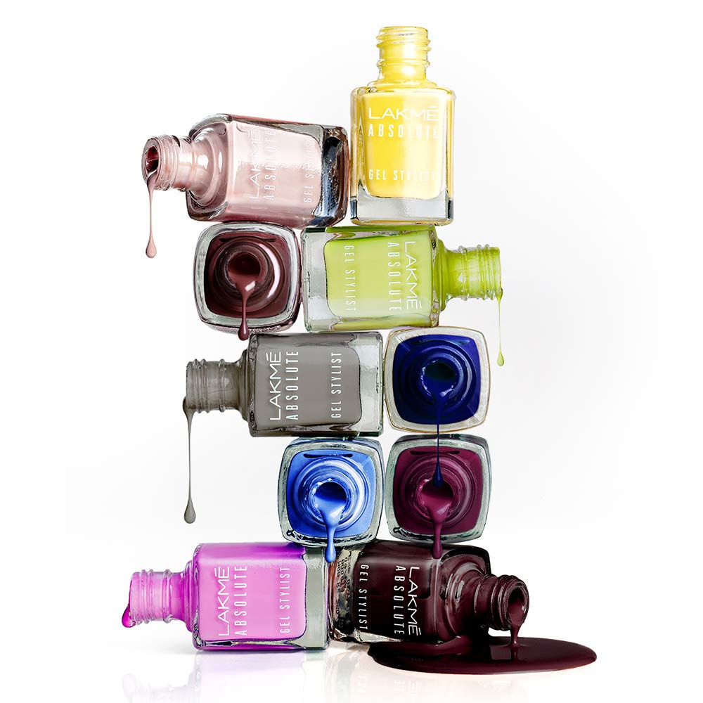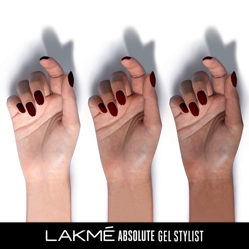 Gel-like perfection on your nails is now as easy as a single stroke with Lakme Absolute Gel Stylist nail colors. Its high shine formula and gel-like consistency delivers stunning nails with intense color payoff. The unique and innovative brush glides easily onto nails in one easy swipe and can be used to create eye-catchy nail art as well. With rich and deep colors and intense gloss finish get DIY salon-like nails from the comfort of your home. Now choose from a range of 50 dazzling shades! Get spoilt for choice with a plethora of pretty pastels beautifully bold and vivaciously vibrant shades. Be it solids metallics or shimmer there's a texture for everyone! Recommended by Lakme Makeup Experts get professional finish gel-like nails every single time.
