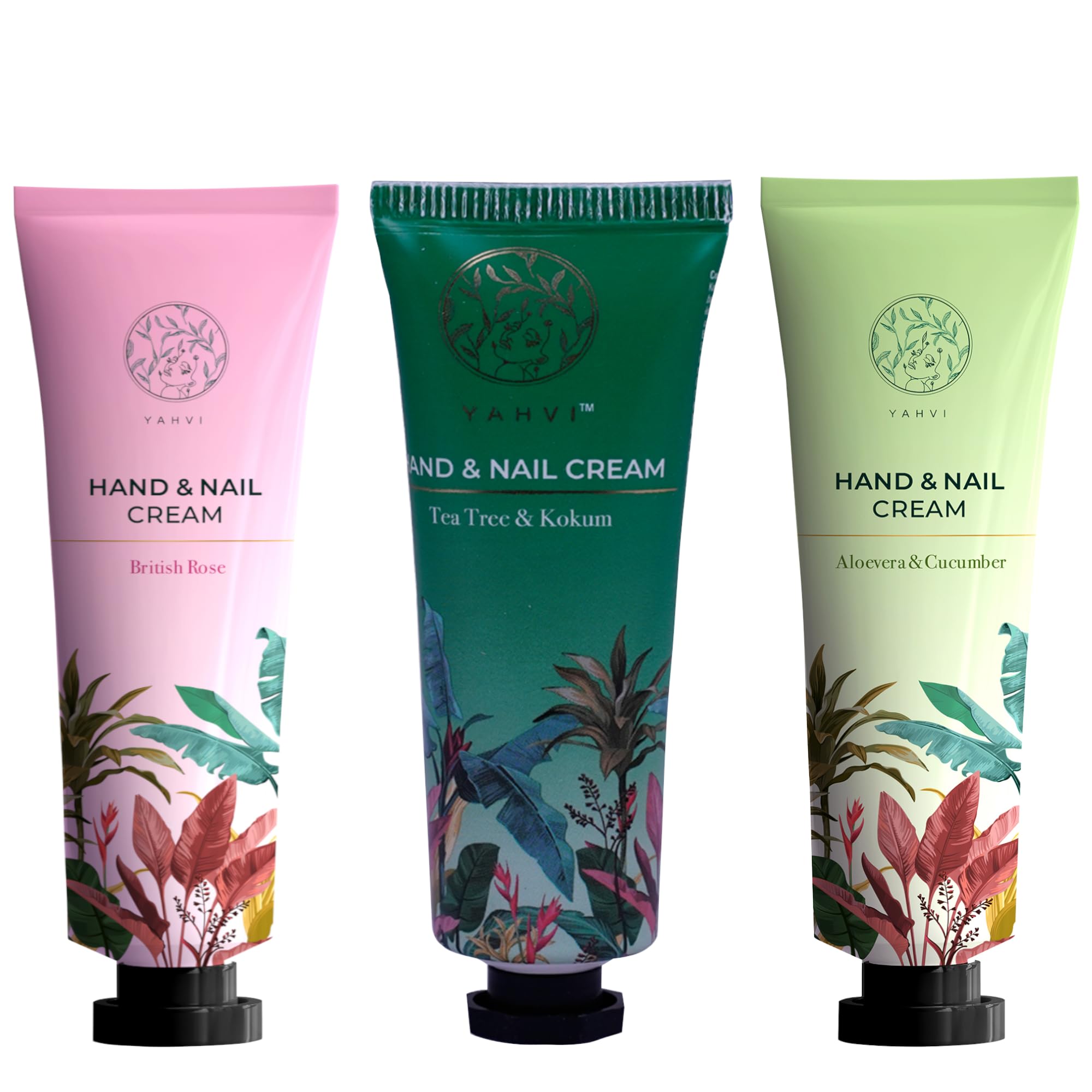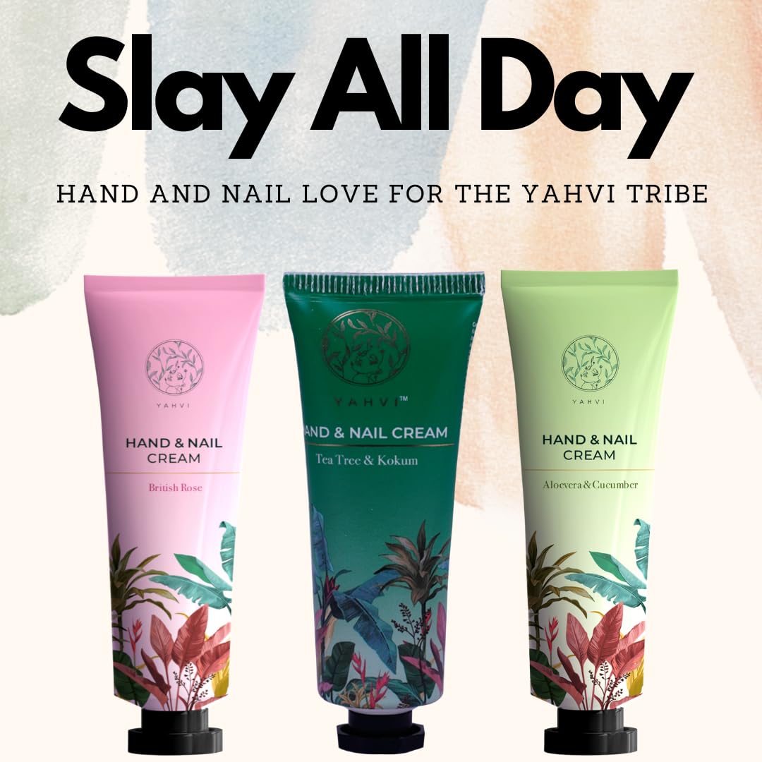 Yahvi Hand & Nail Cream Combos: Nourishing Kokum & Tea Tree Revitalizing British Rose Hydrating Aloe & Cucumber | Ayurvedic Cruelty-Free | Non-Greasy Formulas | Quick Absorption | 30ml