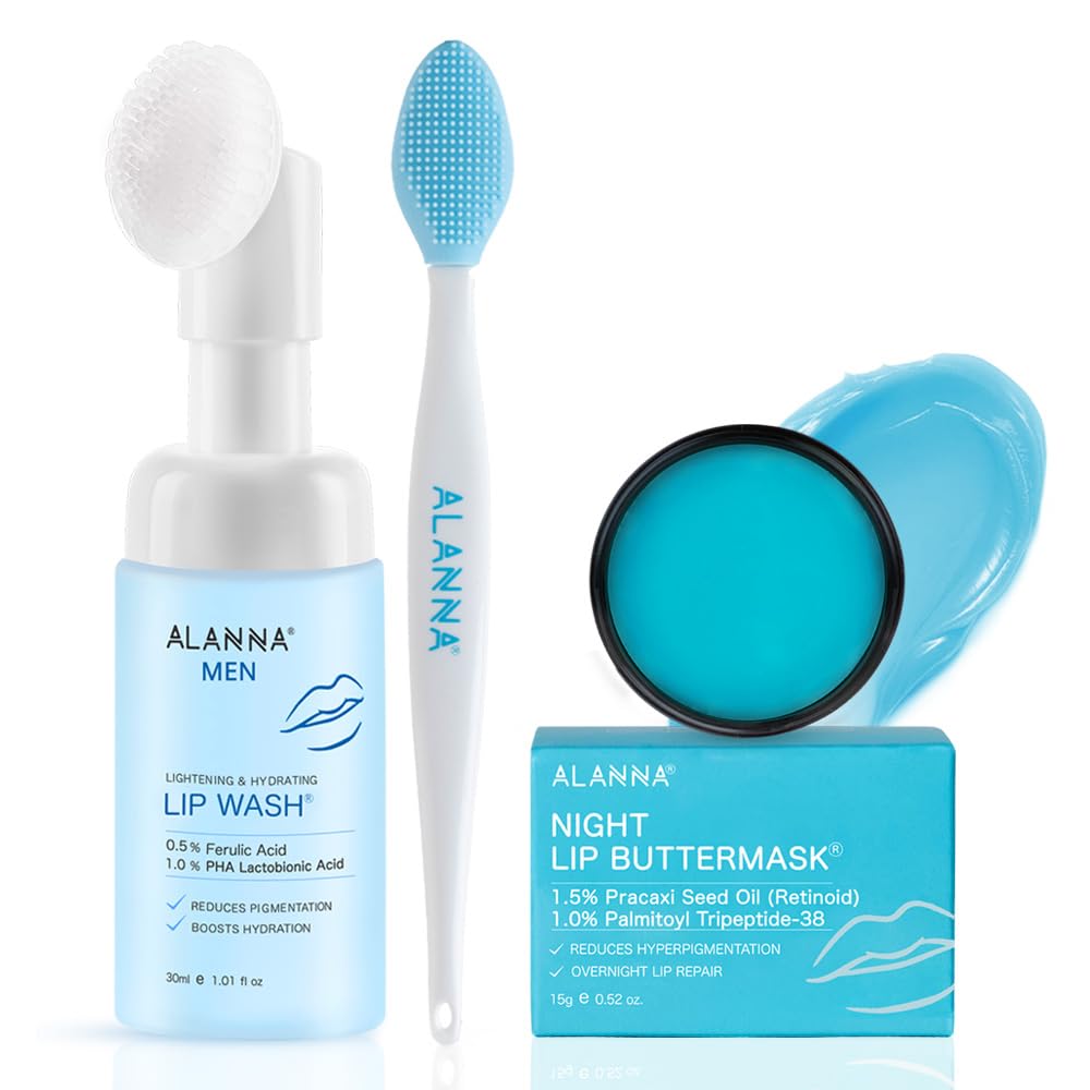 ALANNA® 2-Step Lip Brightening LipWash® & Night Lip ButterMask® | For Dark & Dry Pigmented Lips | Smooth, Even-Toned Lips | Smoke, Sun & Pollution Damage | For Men| 30ml + 15gm