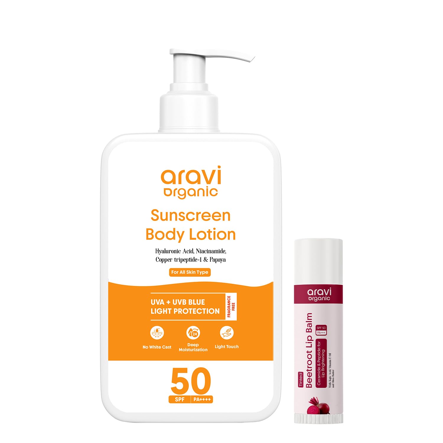 Aravi Organic Sunscreen Body Lotion SPF 50 PA++++ This high-performance sunscreen offers advanced UVA & UVB protection with SPF 50 PA++++ helping to prevent sunburn premature aging and long-term sun damage. Its lightweight non-greasy formula absorbs quickly without leaving a white cast making it perfect for both daily wear and outdoor adventures. Infused with aloe vera and glycerin it soothes hydrates and keeps your skin soft smooth and comfortable throughout the day Aravi Organic Tinted Lip Balm SPF 50 PA+++ Enriched with beetroot extract ceramide and peptide this nourishing lip balm offers more than just sun protection. It hydrates heals and brightens your lips while delivering a soft natural tint. SPF 50 PA+++ guards against UV damage while hyaluronic acid vitamin E oil and shea butter deeply moisturize and revitalize dry or chapped lips.