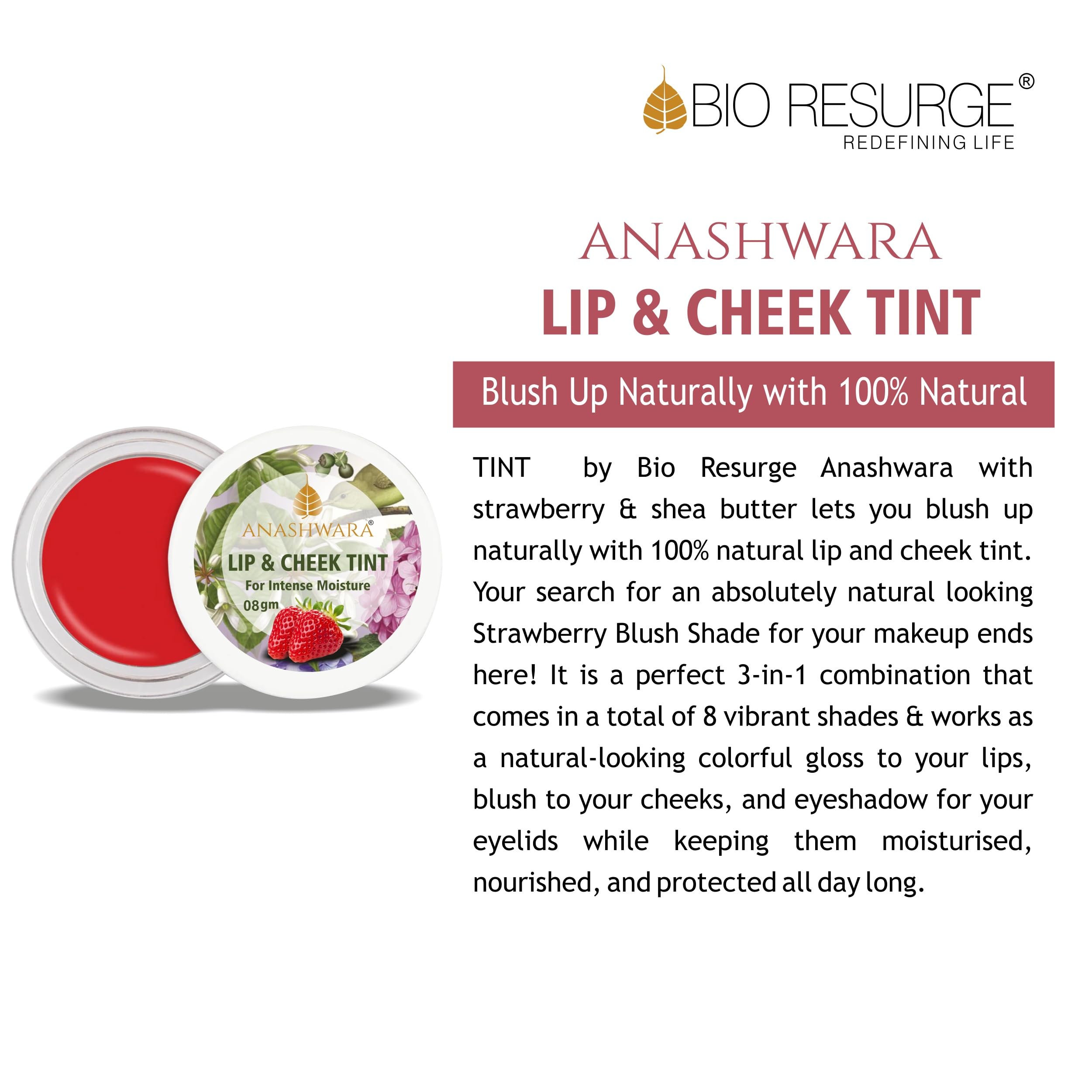 LIP & CHEEK TINT by Bio Resurge Anashwara with strawberry & shea butter lets you blush up naturally with 100% natural lip and cheek tint. Your search for an absolutely natural-looking Strawberry Blush Shade for your makeup ends here! It is a perfect 3-in-1 combination that comes in a total of 8 vibrant shades & works as a natural-looking colorful gloss to your lips blushes to your cheeks and eye shadow for your eyelids while keeping them moisturized nourished and protected all day long.