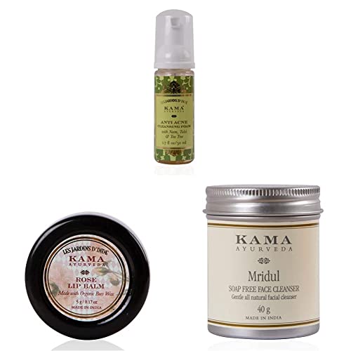 Kama Ayurveda Anti Acne Cleansing Foam, 50ml & Kama Ayurveda Rose Lip Balm, 5g & Kama Ayurveda Mridul Soap-Free Face Cleanser, 40g