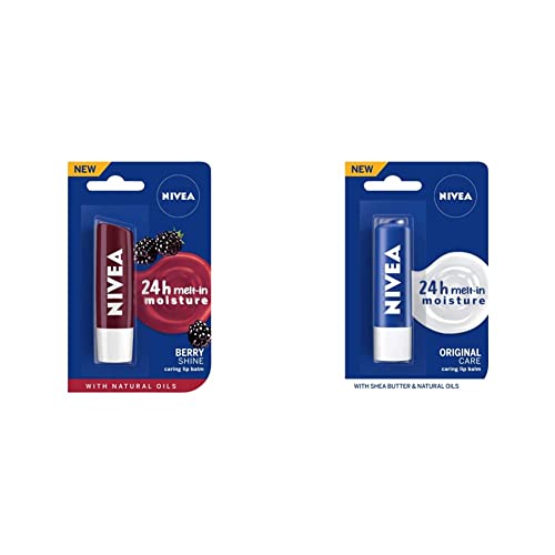 NIVEA Lip Balm Fruity Blackberry Shine 4.8gNIVEA Blackberry Shine Lip Care delights your lips with its delicious blackberry aroma a fabulous shimmer and soft glossy colour. Pamper your lips with its gentle care and long lasting moisturization to get soft and smooth lips long lasting moisturization combined with delightful blackberry aroma and chosen pigments that leave a touch of colour on your lips with NIVEA Blackberry Shine. Your lips care a lot for you now itâs your turn to care for them. NIVEA Blackberry Shine is the new exotic way to love your lipsNIVEA Lip Balm Essential Care 4.8gNivea Original Lip Care nourishes lips that always look and feel their best. Its pampering formula provides rich care and essential protection from drying out for sensationally soft lips.Care Effect-The skin on your lips is much thinner than rest of the body skin it chaps and peels so easily and hence ideally should be kept moisturized with a lip care product. A Lip Balm acts as a lip moisturizer and gives your lips the perfect smooth texture.Experience the rich care of Nivea Original Care with 12 hour care effect.Your lips care a lot for you now itâs your turn to care for them.How it works-The pampering formula with Shea Butter and Panthenol provides a 12 hour care effect leaving your lips sensationally soft and effectively protected from drying out.