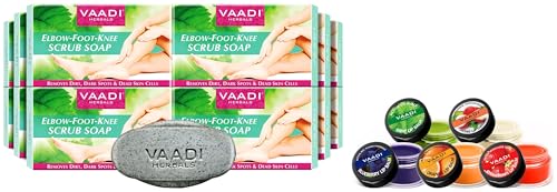 VAADI HERBALS Assorted Lip Balms 10g (Pack of 5) 100% Natural Lip Balms| For Dry & Chapped Lips | 24hr Hydration | & Elbow-Foot-Knee Scrub Soap with Almond and Walnut 75g (Pack of 12)