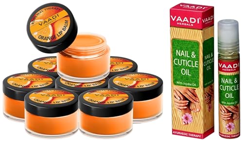 VAADI HERBALS Nail and Cuticle Oil with Jojoba Oil 10ml & Lip Balm Orange and Shea Butter 10gms x 8