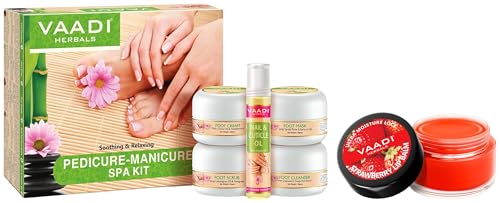 VAADI HERBALS Soothing and Refreshing Pedicure Manicure Spa Kit, Cream and Oil Set, 135g & Lip Balm, Strawberry and Honey, 10g