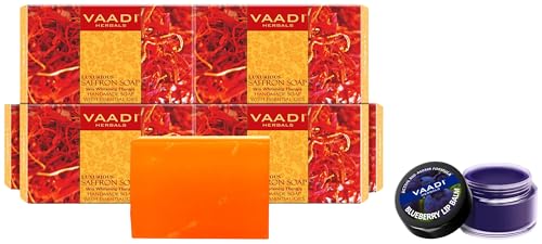 VAADI HERBALS Super Value Luxurious Saffron Skin Whitening Therapy Soap, 75g (Pack Of 6) & Lip Balm, Blueberry, 10g