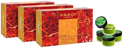 VAADI HERBALS Value Lip Balm, Mint, 4 x 10g & Value Luxurious Saffron Skin Whitening Therapy Soap, 75g (Pack of 3)