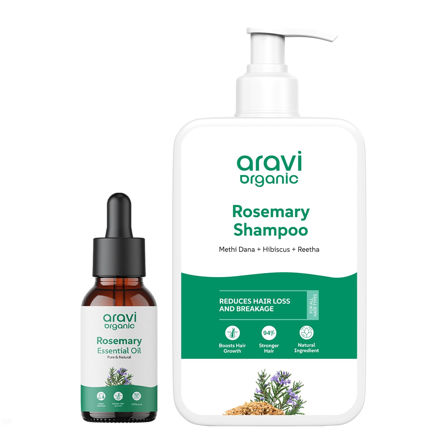 Aravi Organic Rosemary Essential Oil & Rosemary Shampoo offer a natural hair care solution that promotes healthy hair growth strengthens the scalp and adds shine. Infused with pure rosemary extract this duo gently cleanses nourishes and revitalizes your hair free from sulfates and parabens for a chemical-free experience