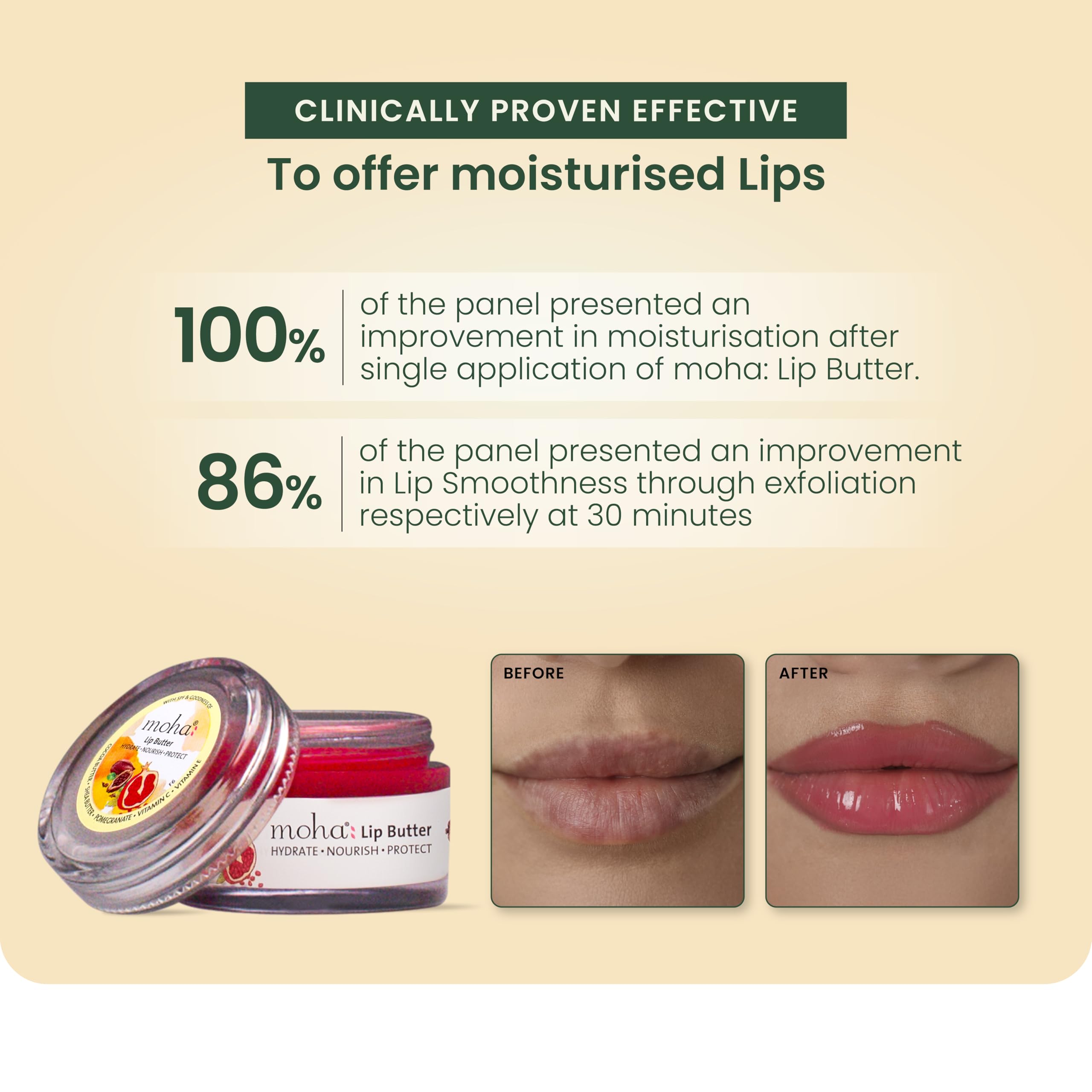 Get velvety soft lips with moha: Lip Butter. This hydrating lip butter Formulated to smoothen and nourish lips reduces the appearance of lip wrinkles. Brighten dull and pigmented lips and leaves it feeling soft and hydrated. Key ingredients: 1. Cocoa butter - Excellent natural moisturizers. It contains fatty acids that help to hydrate and nourish the lips leaving them soft and supple. Cocoa butter is Rich in Antioxidants which helps to protect the lips from free radical damage caused by environmental stressors. 2. Shea Butter - Have emollient properties means they form a protective barrier on the lips to prevent moisture loss. This barrier helps to keep the lips hydrated for longer periods especially in dry or cold weather conditions. 3. Pomegranate Helps to brightens pigmented lips providing a delicate sheen. Its rich in Essential Fatty acid which means it helps to maintain the lipid barrier of the skin preventing moisture loss and maintain lips hydration. 4. Vitamin C - Plays a crucial role in collagen synthesis which is essential for maintaining the structure and elasticity of the Lip skin. By promoting collagen production vitamin C helps keep the lips plump smooth and youthful-looking. 5. Vitamin E Helps to protect the skin from UV damage caused by sun exposure which can contribute to premature aging and dryness of the lips. It helps to improve the texture and appearance of the lips Benefits: 1. Hydration: moha: Lip butter helps to hydrate the lips keeping them soft and preventing dryness and chapping. 2. Nourishment: moha: Lip butters nourish the lips and promote their overall health. The natural ingredients help to repair damage and support the regeneration of healthy lip tissue. 3. Protection: moha: Lip butter forms a protective barrier on the lips. This protection helps to prevent further moisture loss and damage to the delicate skin of the lips. Take a sufficient amount of Lip Butter on your finger and apply it on your lips. Use in