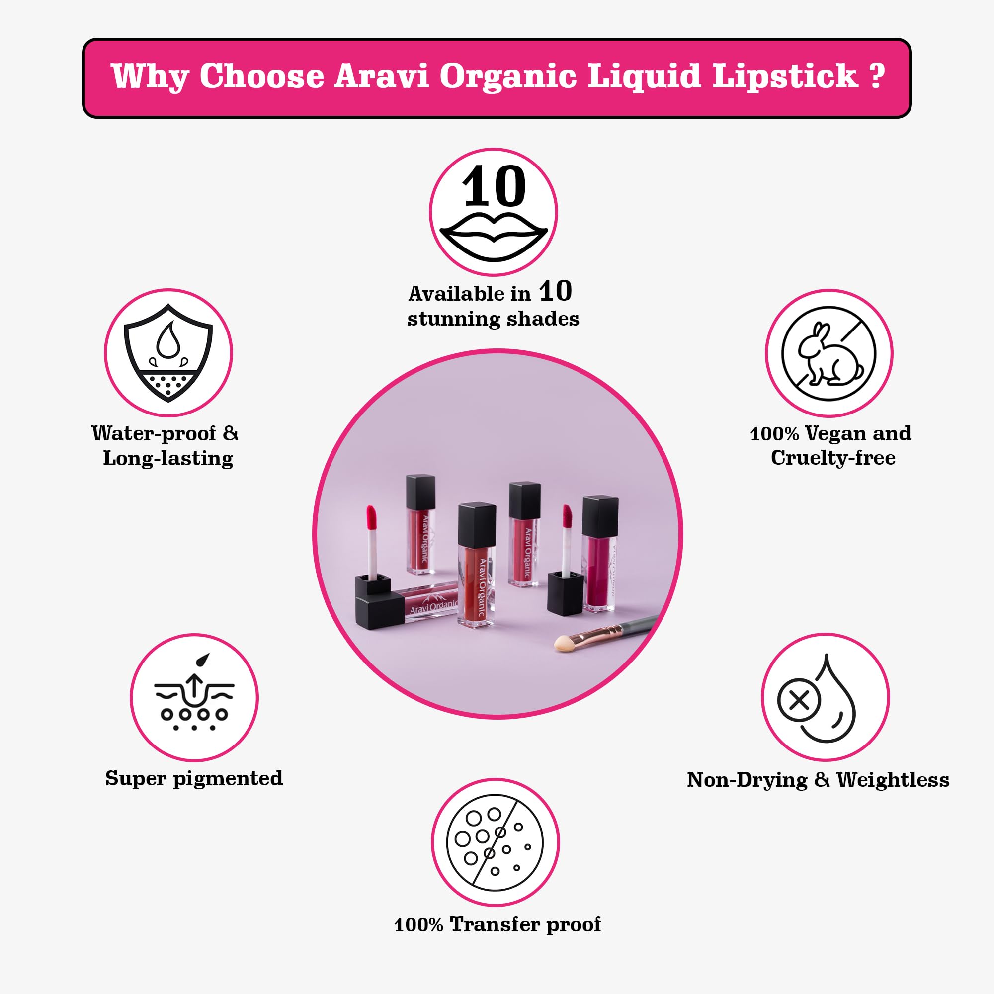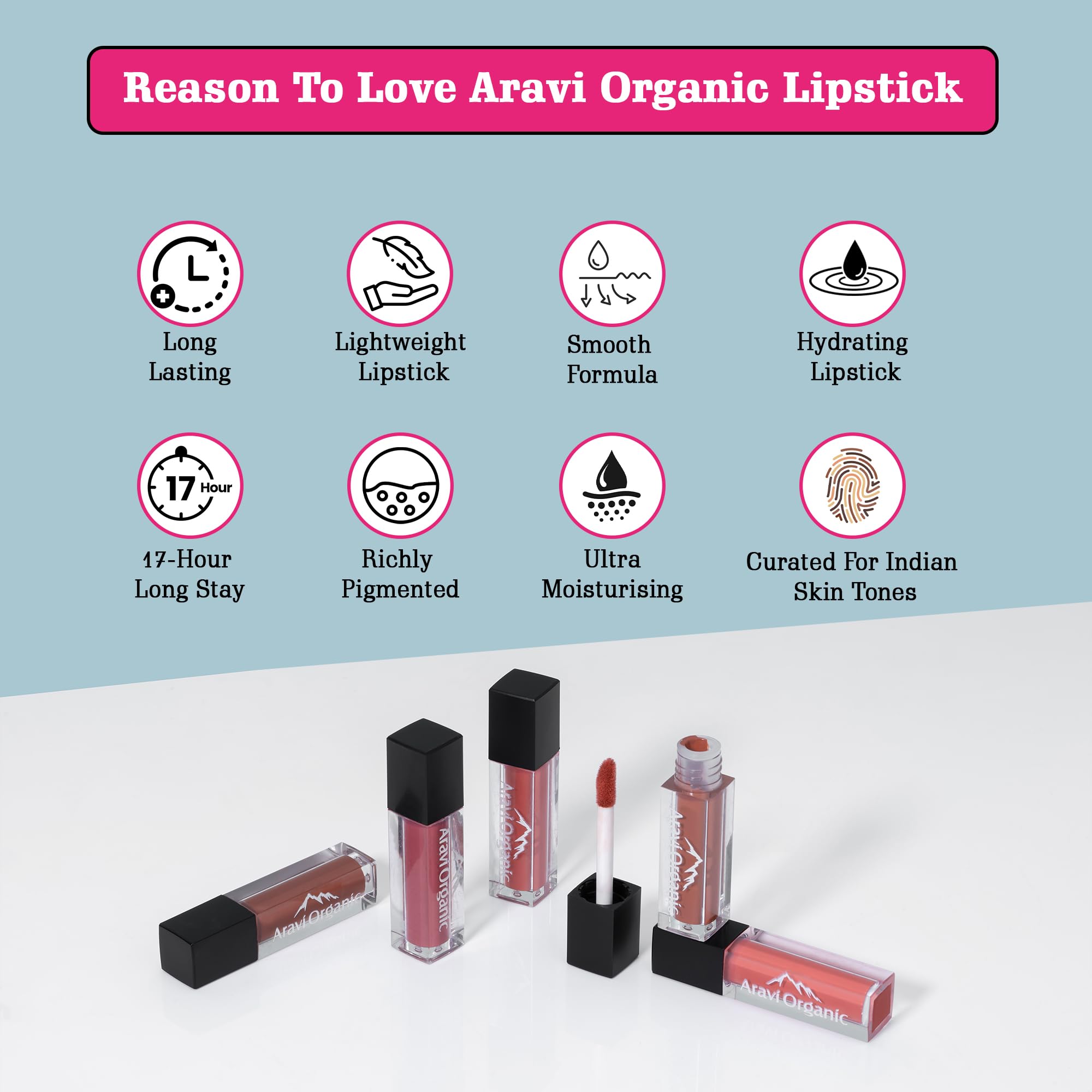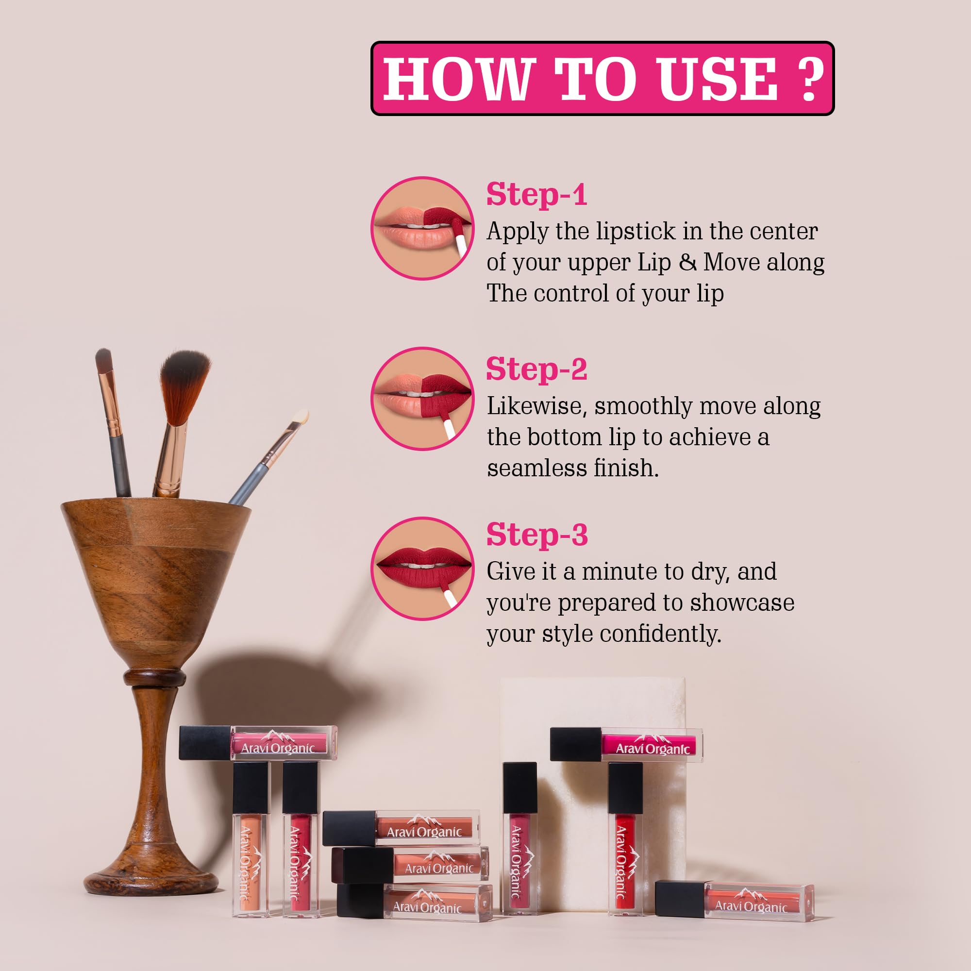 Aravi Organic your beauty routine with our Lipstick Combo featuring waterproof and ultra-smooth benefits. Indulge in long-lasting color that withstands water and humidity while enjoying a luxurious glide-on formula that leaves your lips feeling velvety soft. Key Features: Waterproof Formula: Stay confident all day with a lipstick that resists smudging smearing and fading even in wet conditions. Ultra Smooth Texture: Glide on effortlessly for a silky-smooth finish that feels comfortable and weightless on your lips. Vibrant Shades: Explore a range of stunning shades curated to complement all skin tones ensuring a perfect match for every occasion.Long-Lasting Wear: Enjoy hours of vibrant color without the need for constant touch-ups perfect for busy days and nights out. How to Use: Start with clean dry lips. Apply the lipstick directly from the bullet or use a lip brush for precise application. Start from the center of your lips and move outwards following the natural contours for a flawless finish. Allow the lipstick to dry for a few seconds before pressing your lips together to even out the color.For best results exfoliate and moisturize your lips beforehand to ensure a smooth application and longer wear time.