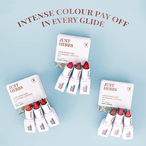 Just Herbs Ayurvedic Creamy Matte Half-Size Lipstick Kit is a trio of #glamorouslygreen shades of Peachy Pink Burnt Red Peachy Coral. Bundle 3 Ayurvedic lipsticks and save more. These lipsticks are infused with Vata pacifying herbs such as Indian Kudzu Shatavari Bhrami Guduchi Yashtimadhu Bala and Manjishtha in a base of Ghee and sesame oil. These natural lipsticks nurture and repair chapped lips by adding nutrition and moisture. Lipsticks are paraben free and are made by cutting out unnecessary ingredients from the formula while making them as wholesome as possible without compromising on the glam factor. Helps moisture & nourish chapped lips Helps stimulate collagen production and repair damaged skin cell Helps add lustrous shine to the lips Helps get soft smooth and an even tone lips These lipsticks do not contain artificial pigments and are made from natural pigments These herbal matte lipsticks are free from harmful chemicals silicones synthetic film-formers & parabens