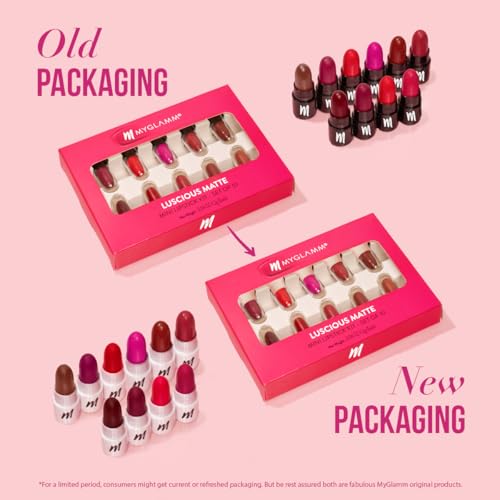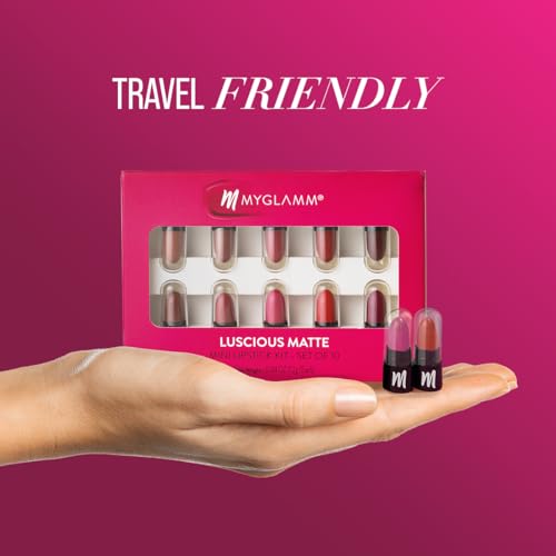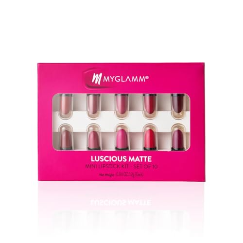 HomeHealth & PersonalSkin CareLip CareLipsticksMyGlamm Luscious Matte Mini Lipstick Kit - Set of 10 | Nude & Bold Lipstick Combo For Women | Long Lasting, Creamy, Moisturising & Pigmented Mini Lipsticks (1.2g x 10)