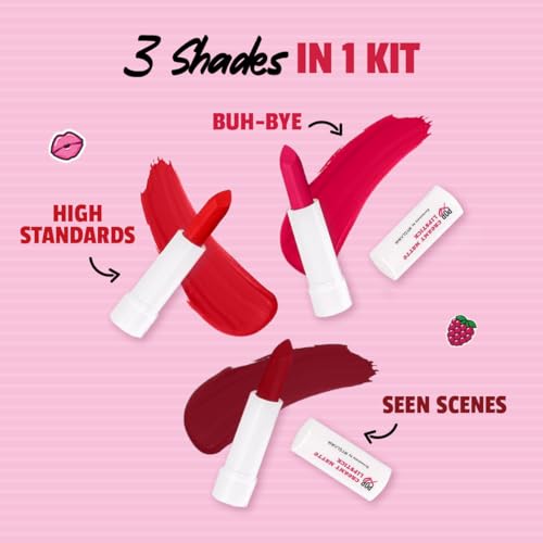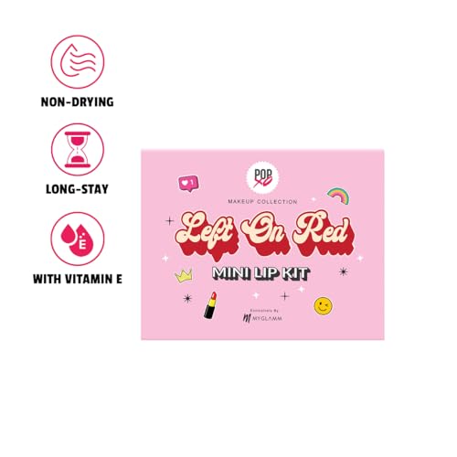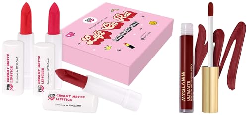 MyGlamm Ultimatte Long Stay Matte Liquid Lipstick - Plum Beauty (Burgundy) | Long Lasting Lipsticks for Women with 8hr Stay | No-Smudge & Waterproof | Intense Colour | Moisturising Formula | 2.5mlThe MyGlamm Ultimatte Long-Stay Matte Liquid Lipstick is a highly-pigmented miracle formula enriched with Vitamin E and glides on easily resulting in a matte finish that doesn't settle into lip lines. In just a single stroke it'll give you a full burst of color that lasts for up to 8 hours while keeping your lips well-hydrated and nourished â making it the perfect choice for everyday wear.MyGlamm POPxo Makeup - Mini Lip Kit - Left On Red - 7.5gm (Set of 3) | Creamy Matte Red Shade Lipsticks| Long Lasting & PigmentedThis Lip Kit includes 3 irresistible pink lipsticks - a light medium and bold lippie - one for every mood duh. These mini lipsticks have a creamy matte formula that glides on the lips smoothly and wears comfortably for long hours. The pigmented formula delivers rich colour payoff in one swipe & is designed to be suitable for all Indian skin tones.
