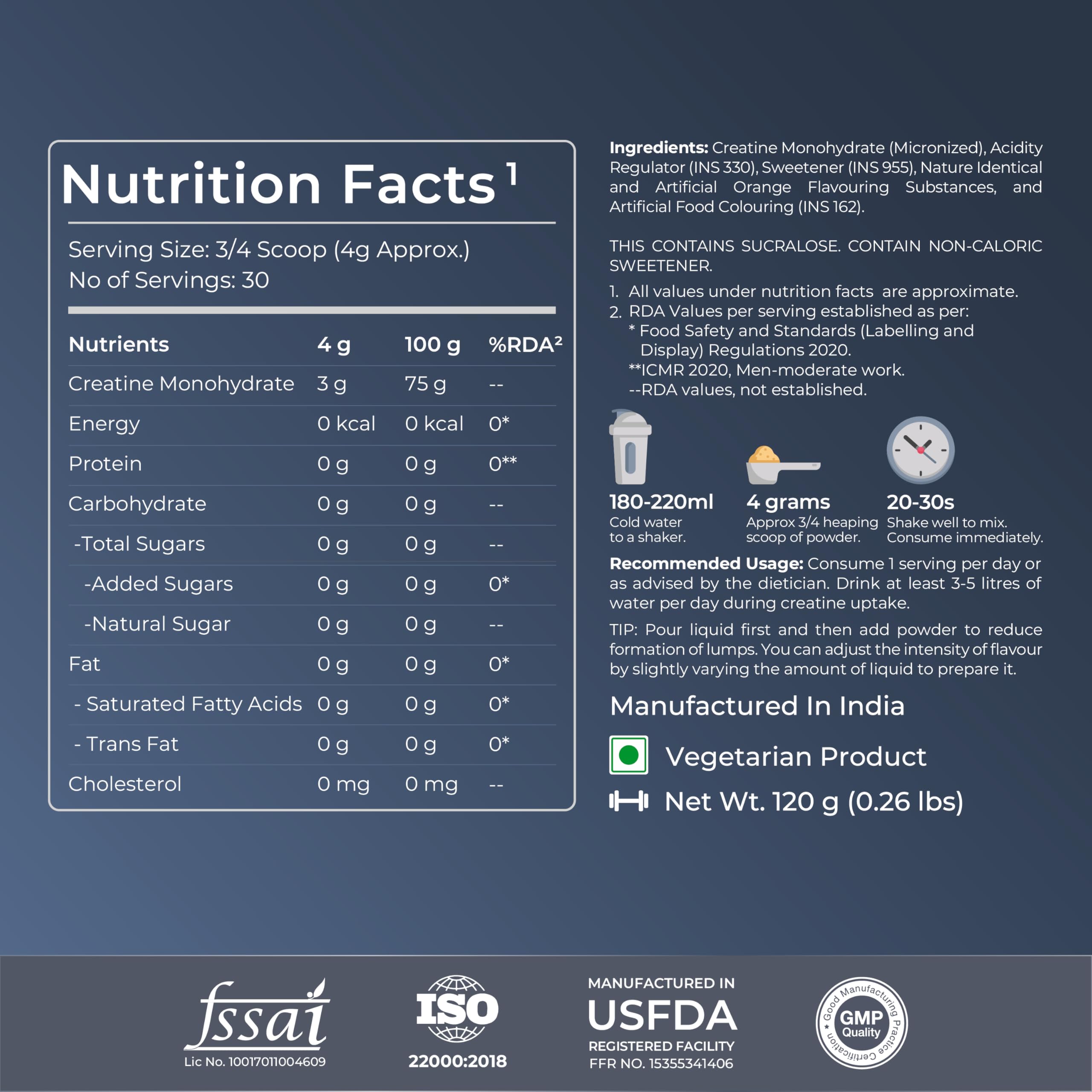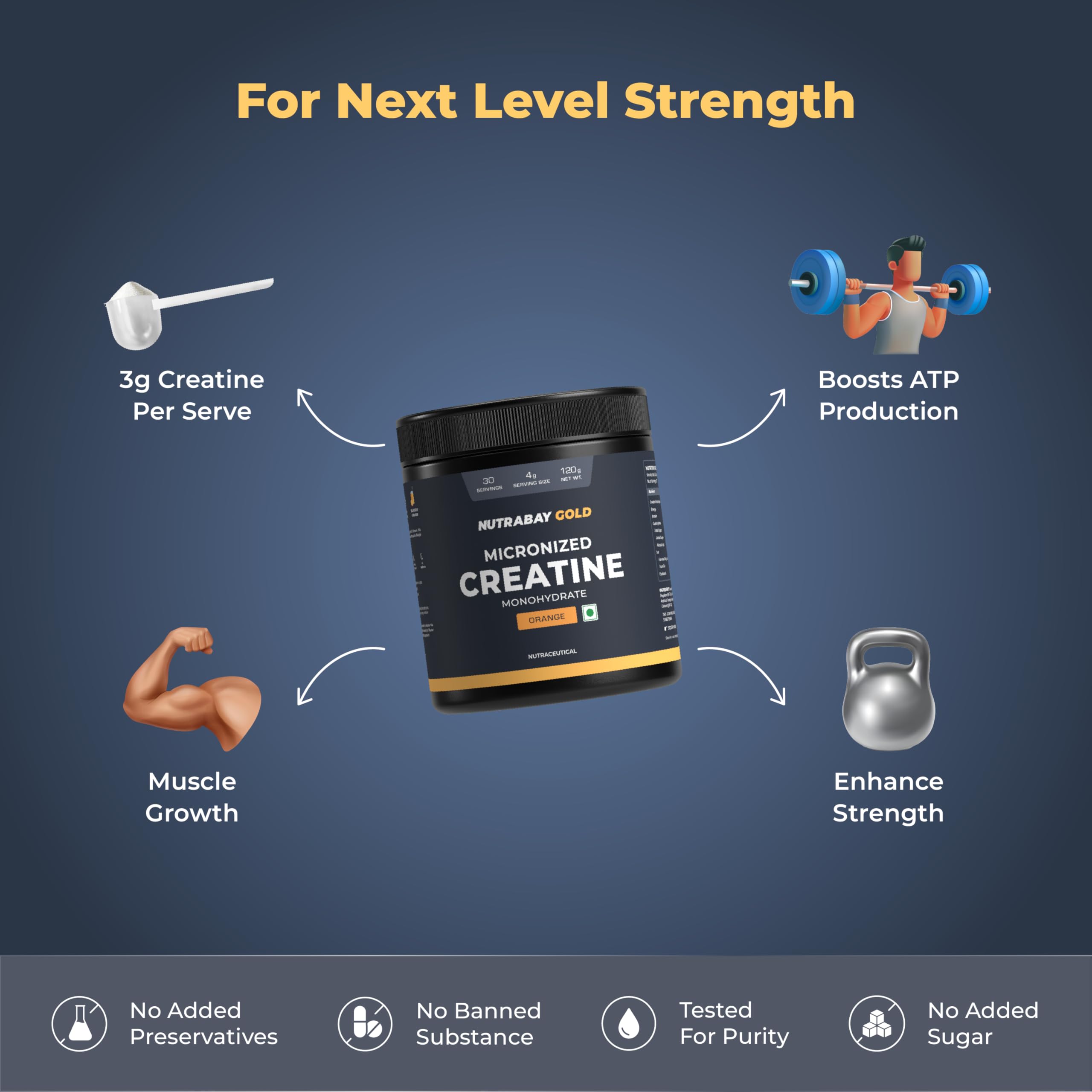 Nutrabay Gold Micronised Creatine Monohydrate Powder - 120g Orange | NABL Lab Tested | 3g Creatine/Serving | Increases Muscle Mass Strength & Power | Pre & Post Workout Supplement | For Men & Women