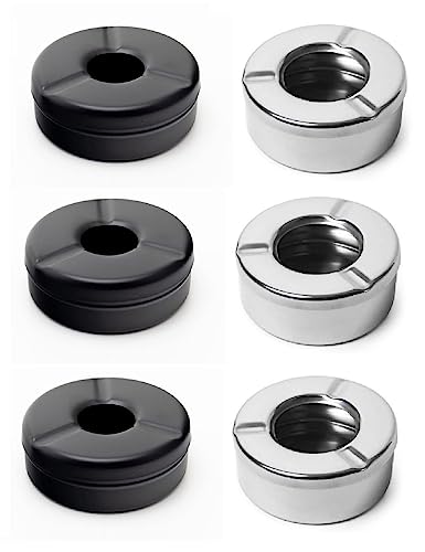 This standard-size lid ash tray is made of strong stainless steel A great ashtray for home or for use in any bar club or restaurant with smoking facilities They feature 3 resting slots rather than firm grip slots allowing for less broken cigarettes Multicolor lid ash tray which can provide a gorgeous look to your bar or restaurant The design is made to work in any setting or establishment. This ashtray is a definite choice for any outdoor dining beach bar patio bar and pool deck type environments Product Dimension- 8.5x8.5x4 cm each Color- Black matte Silver Set of 3 Black 3 Silver Lid ash tray