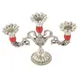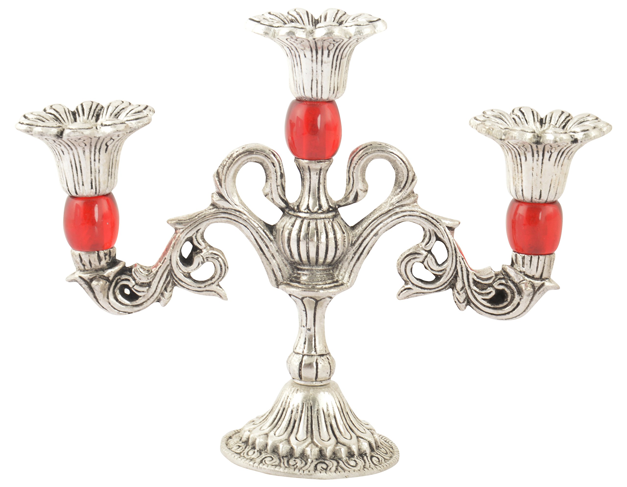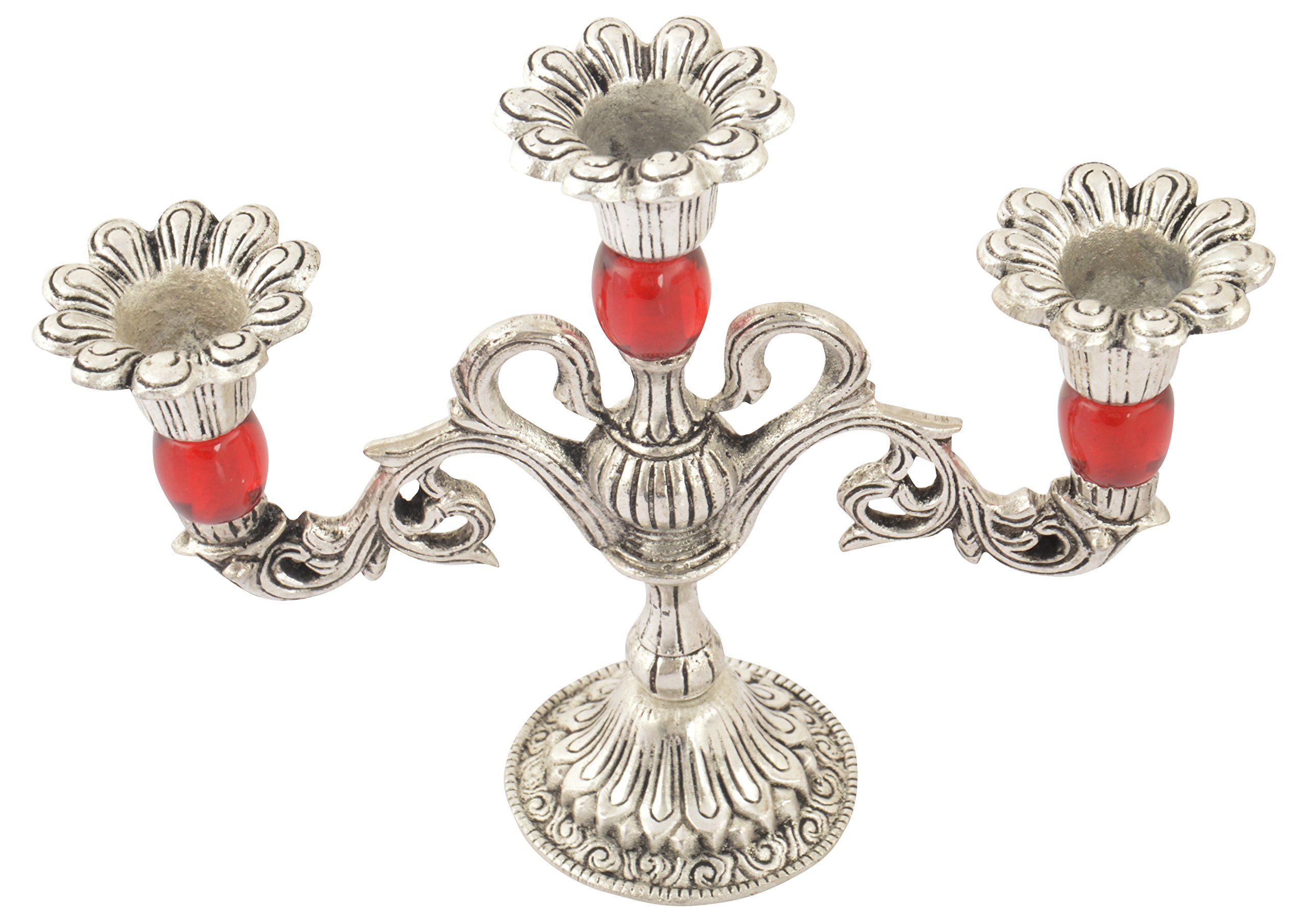 The product is made up of aluminum and is silver in color.The product has 3 candle holders . its a unique masterpiece with traditional antique look. you can also gift this showpiece to you dear ones on occasion of festival and weddings.