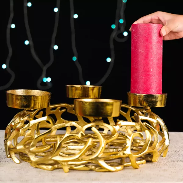 The Candle Stand is an elegant and sophisticated home decor item that is designed to hold four candle pilla. It features a luxurious gold finish that adds a touch of glamour and opulence to any space.