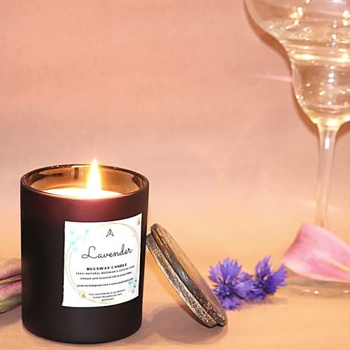 Natural Beeswax color Black Matt Glass Jar Lavender Scented candles made from other wax beeswax candles burn brighter and cleaner as they emit negative ions that are known to help purify the air.beeswax emits a sweet subtle honey-like fragrance. candles made with 100% natural & pure beeswax added with natural fragrances candles comes in a calm black matt glass jar with the sweet scent of Lavender burn longer and cleaner than candles made with other waxes