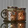 Vintage and beautiful light up this votive in your home and create an aura of mystique and tranquility. Let the candle flames entice you to another world. This exclusive Glass Jar Votive is coated with Silver from inside and has designer surface giving it regal touch and feel. In addition decorated with a Pearl Neck to enhance its beauty and vintage appeal. Simply light a wax Tea-Light inside or simply keep it alike. "