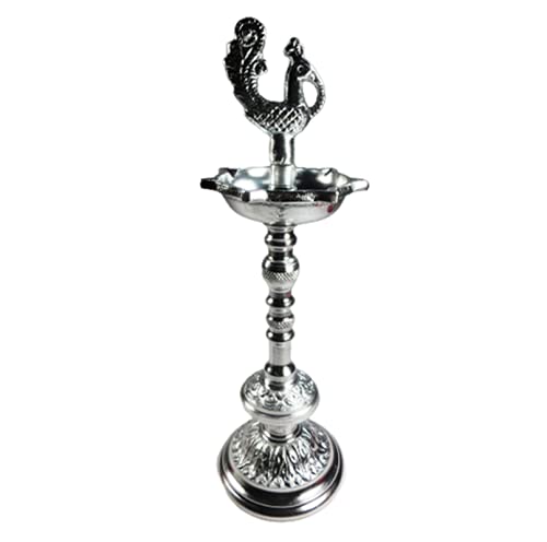 WOOD CARVING WORK WHITE METAL Finish DIYA: Peacock-Topped TALL KASHI SAMAI KUTHU VILAKKU SAPTA (07-Notched) DEEPAM/ JYOTI/ LAMP with Stand (11 Inches: Please RE-ASSEMBLE on receipt - as per photo instructions)