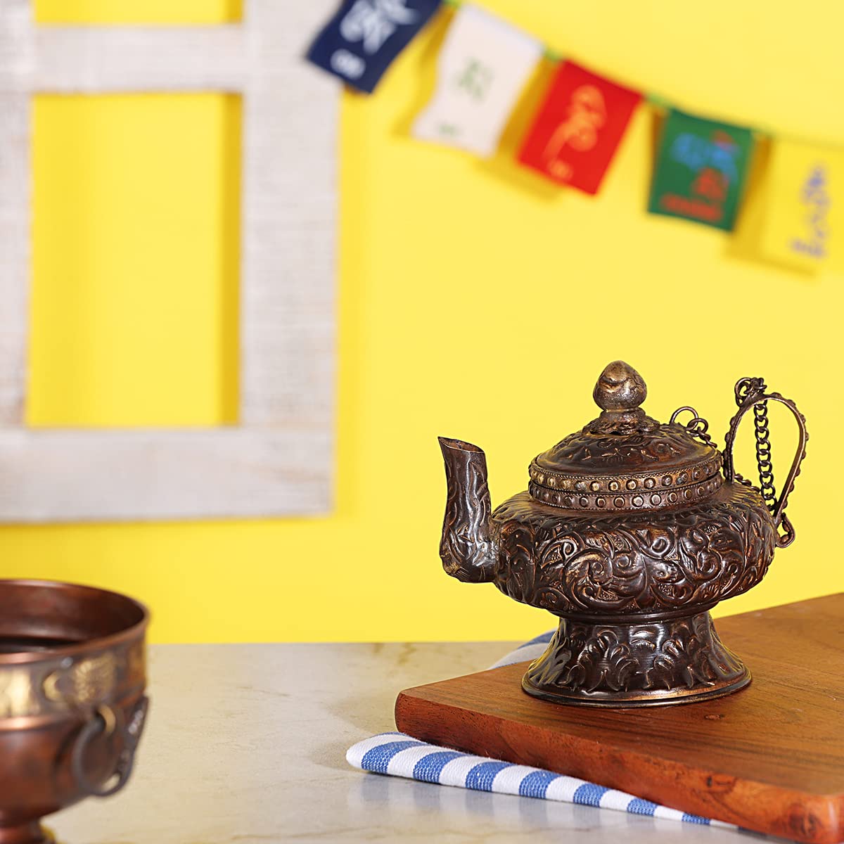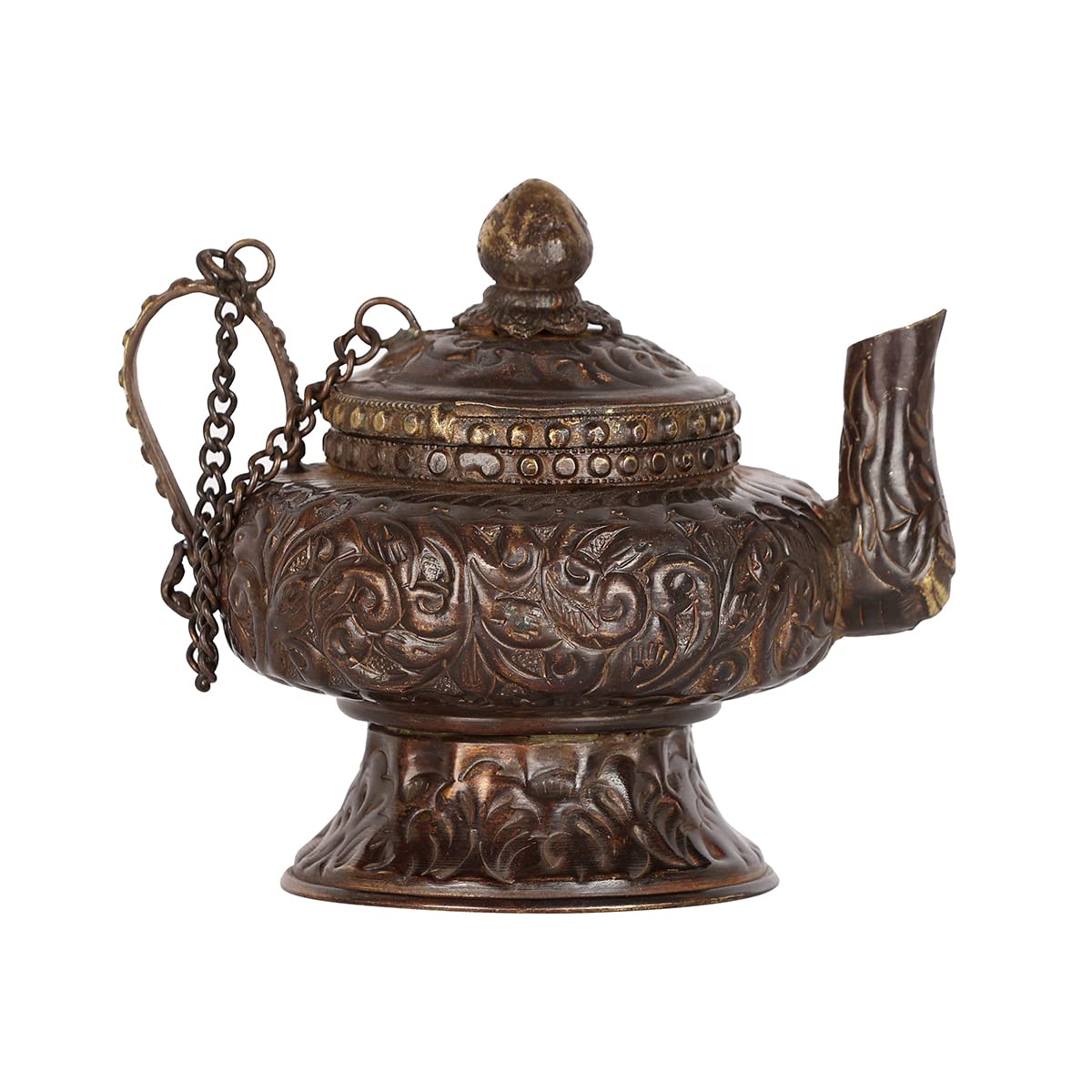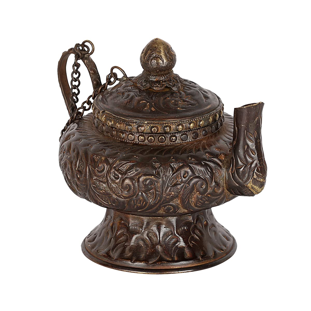 Brass antique finish tibetan buddhist style teapot/decorative table showpiece with a very beautiful handcarved base very well and fine handcrafted product