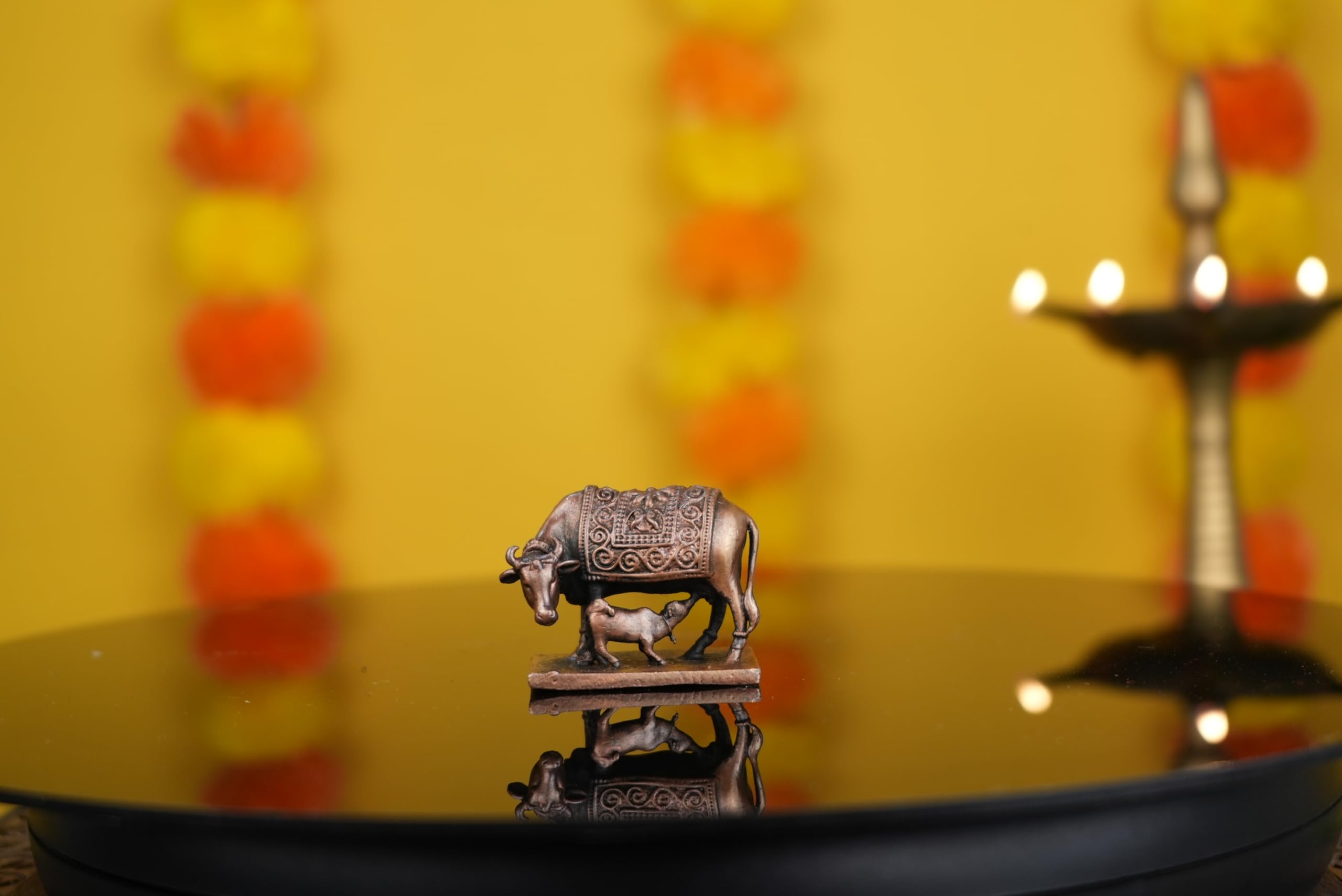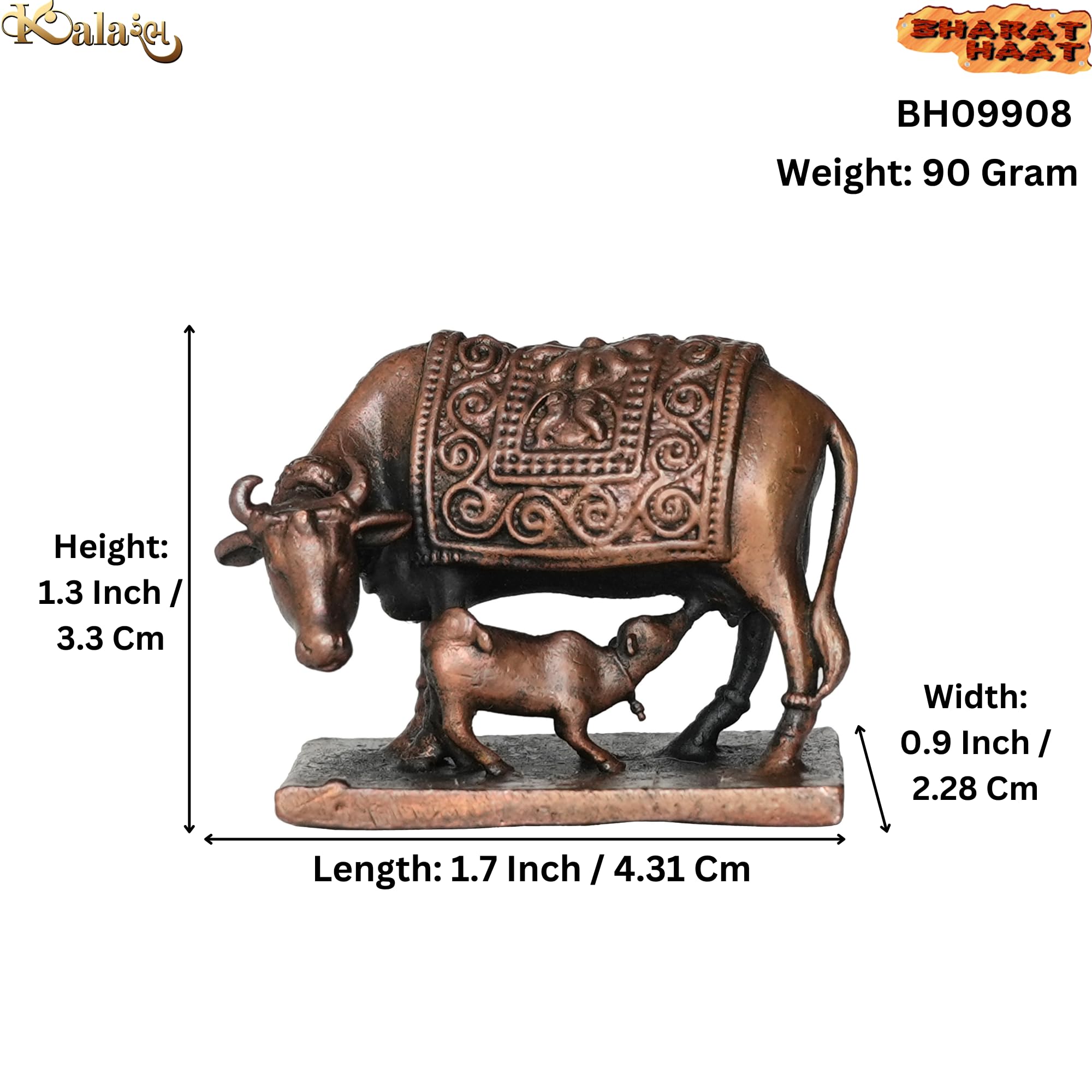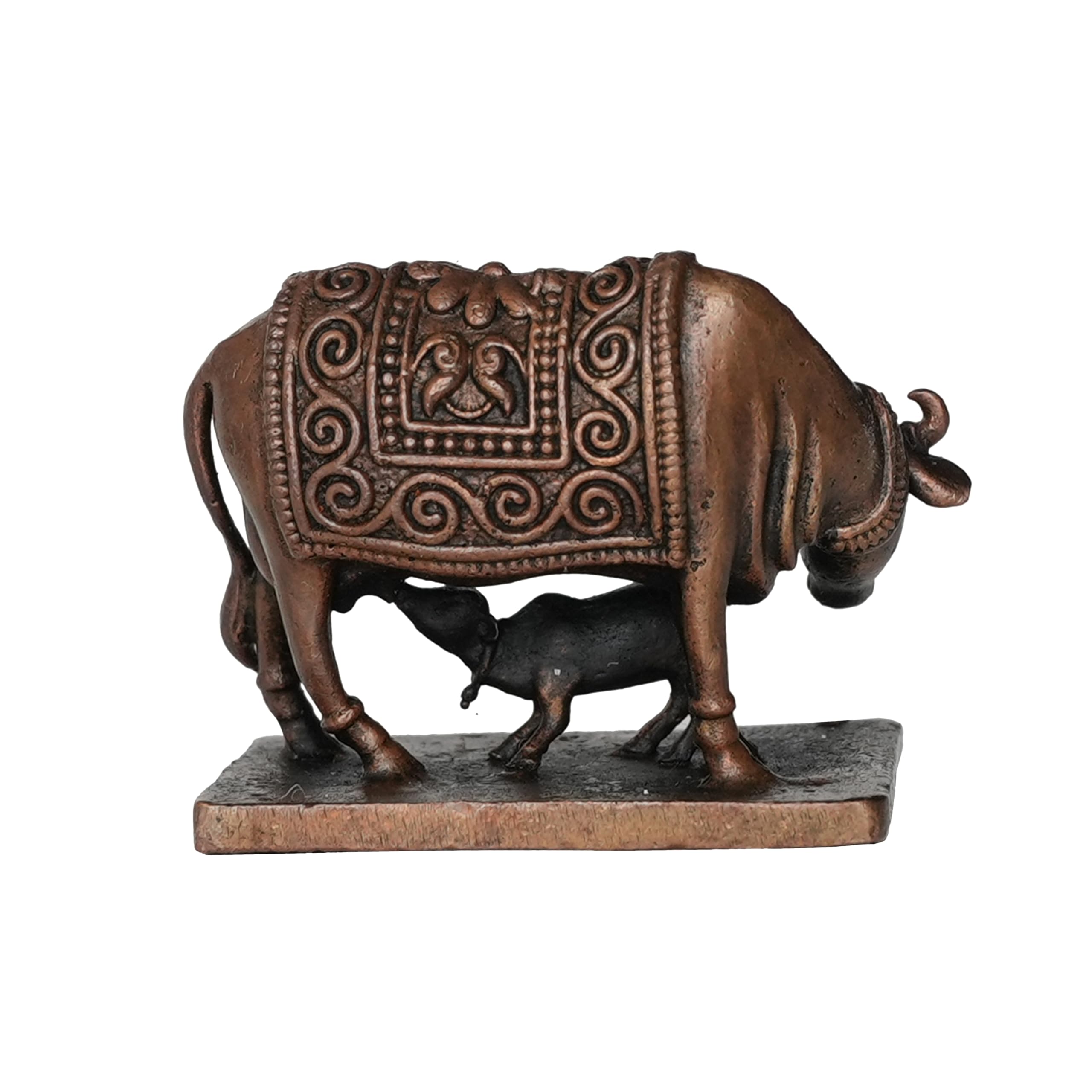 Copper Cow & Calf Set Home Office Temple Mandir Pooja Puja Room Handicraft Art Showpiece Brings Prosperity Made from Brass Each of these products are made of solid brass with carefully designed products suits for every possible place that this art can fit This Statue is durable and long-lasting Gifting Each of our products are suitable for gifting purpose. This brass decoration item enhances the decoration and gives safe and silence vibe in the home. This is perfect for home office use. A valuable personal and professional collection Measuring 4.31 Ã 2.28 Ã 3.3 (L Ã W Ã H) Cm and Weighting 90 Gram. This statue is substantial and impactful. Clean by Dry Cloth and Use Pitambari Powder Specially for Brass Material