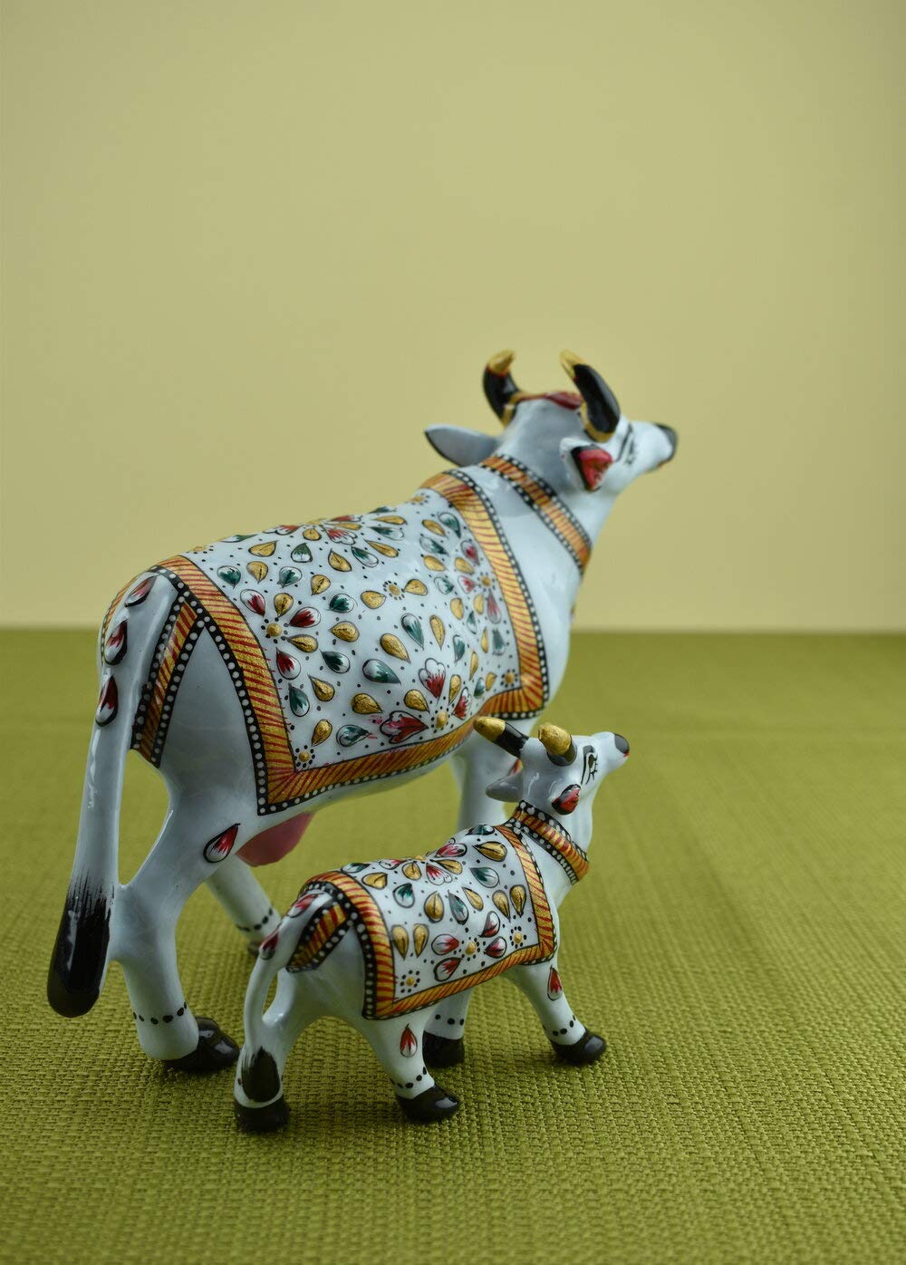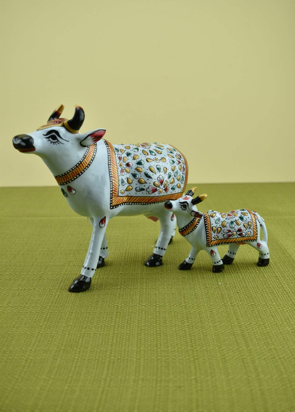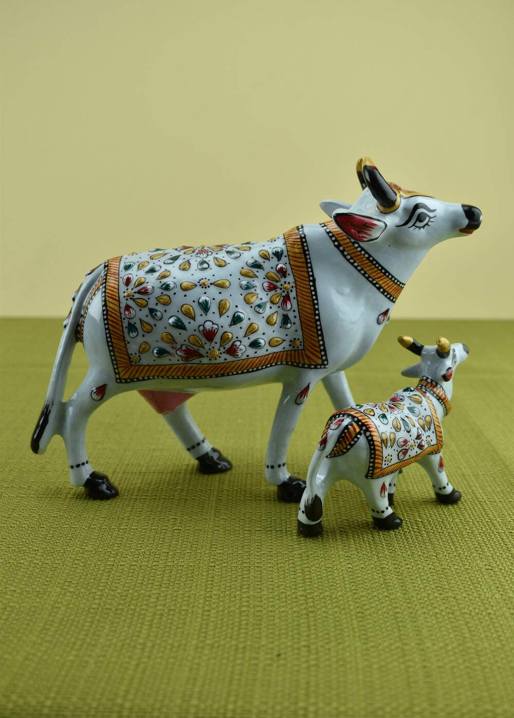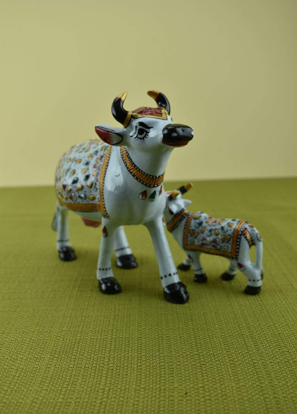 These traditionally Handcrafted Royal Metal Cow from our "Meenakari Collection" has been deligently designed with execellent details and is decorated with finely polished jewellery clothing by fusing brilliant and rich colours over it. - It has been embellished with rich Meenakari work which makes the combo Graceful.