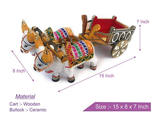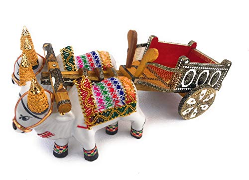 Navrang presenting a very good showpiece that provide a royal touch to decor your home office and living room. This decorative item Enhance the decor value of the house office hotel temple etc. Great ideas for wedding gifts anniversary gifts house warming ceremonies Birthday gifts new venture award ceremonies Diwali and festival gifts. A symbol of traditional Indiathis Bullock cart is a beautiful piece of art. Exotic decoration for your home and office.Place this calm art piece in your living room for an effervescence beauty or gift it to your loved ones before he/she enters a new phase in life.