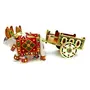 Wooden Decorative Bullock Cart With Dry Fruits Box. A wooden decorative bullock cart is a decorative item that is made of wood and is designed to resemble a traditional bullock cart. Bullock carts are a traditional mode of transportation in many rural areas of India and are still used in some parts of the country today. These carts are typically made of wood and are pulled by oxen. A wooden decorative bullock cart can be used as a decorative piece in a home office or as a showpiece. They are often handcrafted and can feature intricate carvings detailed painting and are usually made of good quality wood like teakwood. They can be used to add a rustic touch to a room or as a conversation piece.