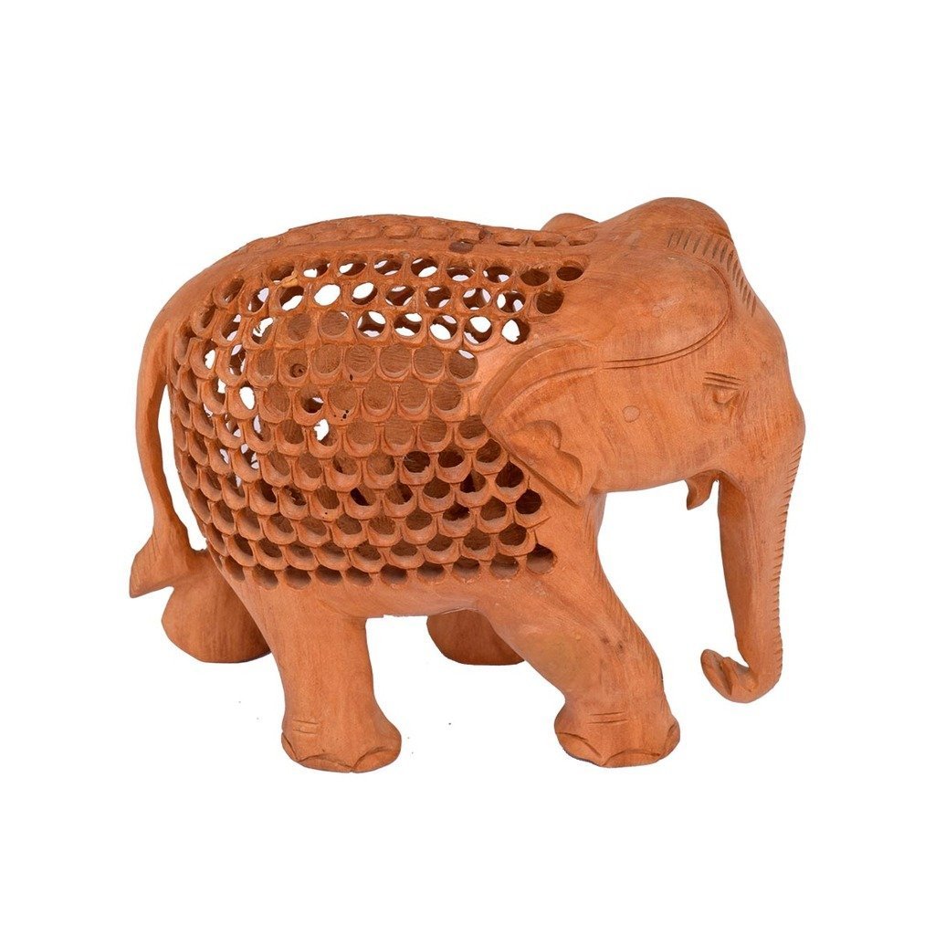 Purpledip Wooden Jali Carving Elephant Showpiece: Indian Souvenir Gift Feng Shui Vastu Showpiece Medium(10715)