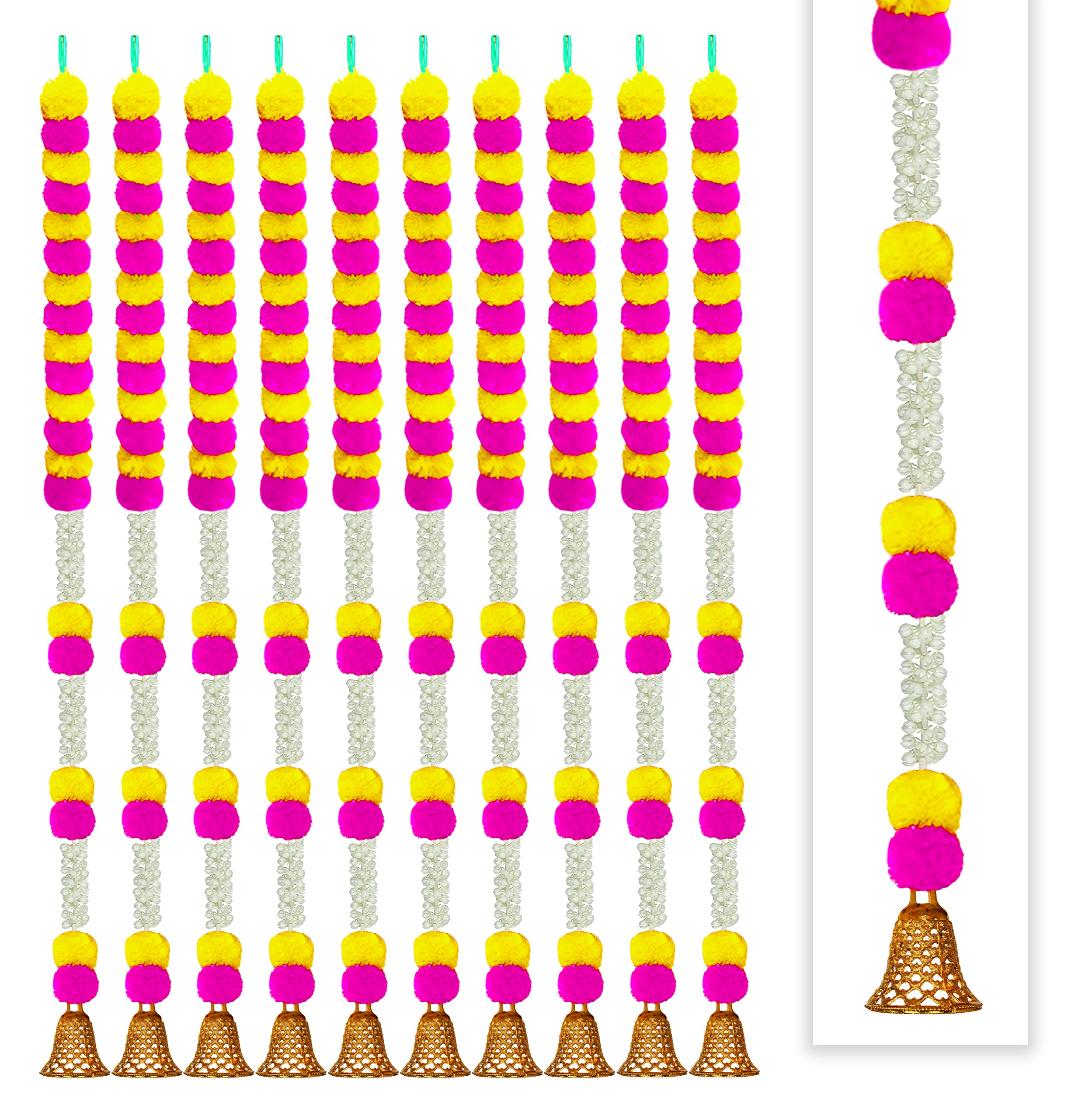 Craftox Decora Handmade Artificial Fluffy Marigold with Jasmine Flower Garland with a Golden Bell at The Bottom Used for Decoration Colour Pink & Yellow Pack of 10 (33004-10)