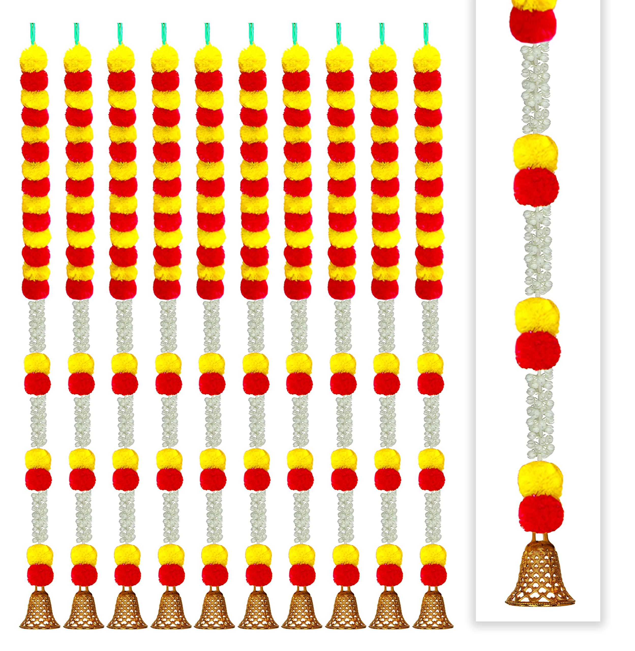 Craftox Decora Handmade Artificial Fluffy Marigold with Jasmine Flower Garland with a Golden Bell at The Bottom Used for Decoration Colour Yellow & Red Pack of 10 (33006-10)