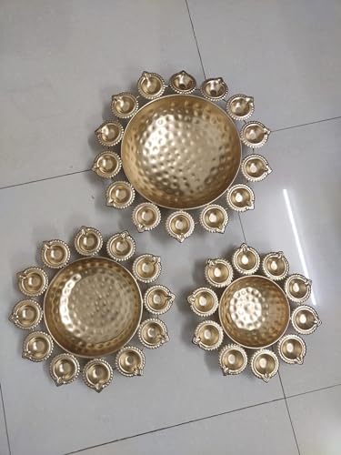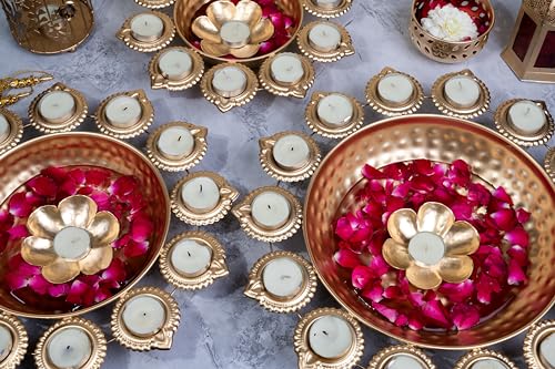 This Urli is made of metal and is sturdy and the metal urli do not bend or twist. It adds a vibrant touch to your indoor or outdoors when filled with flowers and T- Lights. The urli makes a handsome addition to the decor of any room and now you can enjoy the beauty of one that is made according to the time-honored traditions in your own home with the Handmade Metal Urli. Produced using sand casting techniques that have been passed down through generations of skilled metalworkers the Handmade Urli is a truly authentic Indian urli. To display the bowl in the traditional way fill it with water and then float living or artificial flowers on top. Add water to the urli mix a bit rose water and float flowers of your choice. Create a beautiful ambience by placing these urli in occasions. You can also place floating candles on the surface of the water. No matter how you use the Handmade Metal Urli you're certain to be impressed with its quality! Beautify your home with this traditional Indian decorative design. This urli is a perfect showpiece for those festive occasions when many people will visit you at your residence. Also to enhance its beauty even more we have a set of floating diya along with this urli.
