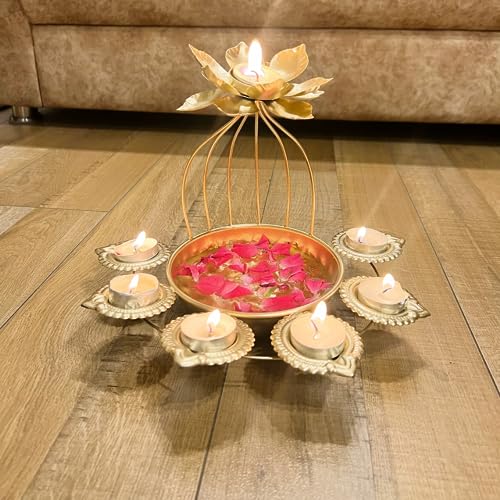 METTALLIC FINISH : The metallic finish adds to the beauty of the artefact and makes it a luxe addition into your interior. PRODUCT USE : Rose Urli Bowl for Home Decordiwali decoration items for home decor home decor items decorative items for homediwali diyas diwali decoration itemsFor water diyas for diwali DESIGN : Rose Diya Urli is patterned after the classic Indian design with intergrated handles and an attractive tappered shape. This can be displayed empty or filled with water to float candles or flowers CARE INSTRUCTIONS : Never use any harsh chemicals or never rub it with any rough surface Wipe it with clean piece of dry Cloth . IDEAL GIFT : An ideal gift and perfect for house warming and anniversary gifting as well.Great gift idea for anyone who appreciates beautiful handcrafted items for their home. Metal Urli Bowl with Diyas for Home Decoration Looking for a stylish and classic addition to your home dcor? Look no further than our beautiful decorative urli bowl! Crafted from high-quality materials and featuring an elegant design this bowl is perfect for displaying tea light candles flower petals or even potpourri. Its versatile style makes it a great addition to any room in your home from the living room to the bedroom to the dining room. With its smooth surface and durable construction this bowl is easy to clean and maintain