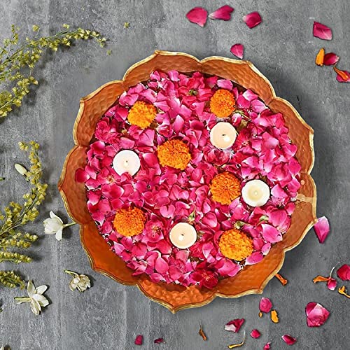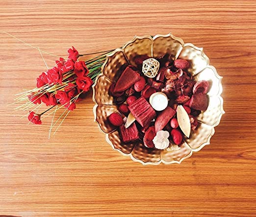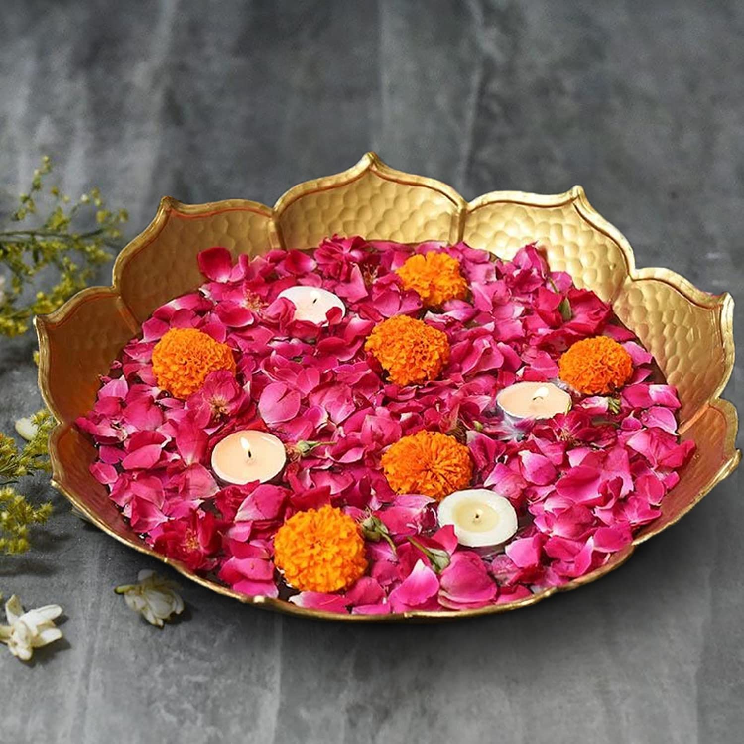 The Lotus Urli Bowl is a stunning and symbolic decorative piece that embodies beauty purity and spiritual significance. Crafted with intricate details and exquisite craftsmanship the Lotus Urli Bowl adds a touch of elegance and tranquility to any space. The Lotus Urli Bowl is typically made of brass a durable and long-lasting material that can withstand the test of time. It is meticulously shaped and adorned with lotus motifs showcasing the skilled craftsmanship of Indian artisans. The brass is often polished to a high shine giving the Lotus Urli Bowl a luxurious and radiant appearance. The shape of the Lotus Urli Bowl is reminiscent of a wide-mouthed bowl or basin with a rounded bottom and flared sides. It is designed to resemble a lotus flower in full bloom. The lotus is a sacred flower in many cultures symbolizing purity enlightenment and spiritual awakening. Its presence in the Lotus Urli Bowl adds a sense of serenity and tranquility to the overall design. The outer rim of the Lotus Urli Bowl is adorned with beautifully sculpted lotus flowers petals and leaves. The lotus flowers are intricately crafted capturing the delicate and graceful nature of the real flower. The petals are meticulously shaped creating a visually captivating display of nature's beauty. The lotus leaves add depth and texture to the overall design enhancing the overall aesthetic appeal of the bowl. The Lotus Urli Bowl holds great cultural and spiritual significance in Indian traditions. It is often used for ceremonial purposes and festive occasions. The bowl is filled with water and adorned with fresh flowers such as lotus petals or other auspicious flowers which are considered sacred in Indian culture. This practice is believed to bring blessings purity and positive energy to the household creating an auspicious and inviting ambiance.