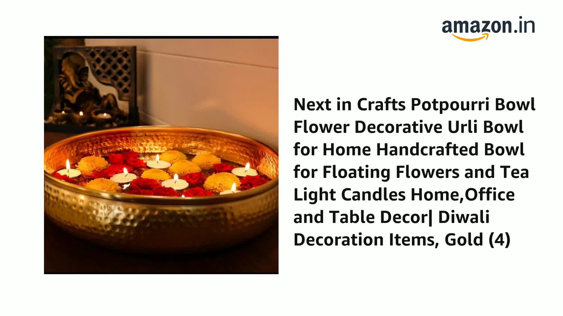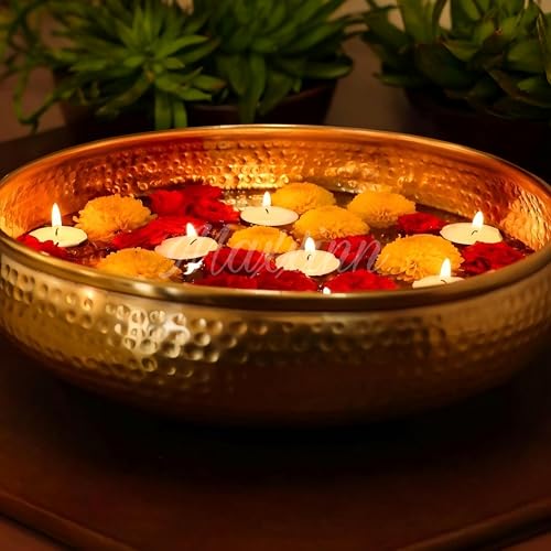 t sounds like you're describing a decorative bowl that is designed in the shape of a Diya (a traditional Indian oil lamp) and is used for floating flowers and tea light candles. This type of decor is often associated with Diwali the festival of lights where decorative items are used to enhance the festive atmosphere. The bowl you mentioned is likely handcrafted and made from metal with a gold finish giving it an elegant and festive appearance. It can be used as a centerpiece for home office or table decoration especially during Diwali celebrations. To use the bowl you would typically fill it with water and float flower petals or small flowers on the surface. Tea light candles can also be placed in the water creating a beautiful and serene ambiance. The reflection of the candlelight on the water's surface adds to the visual appeal of the decoration. This type of decorative bowl combines traditional elements with a modern and decorative touch making it a versatile and eye-catching piece for various occasions and settings. It's a wonderful way to infuse your space with cultural significance and aesthetic beauty.