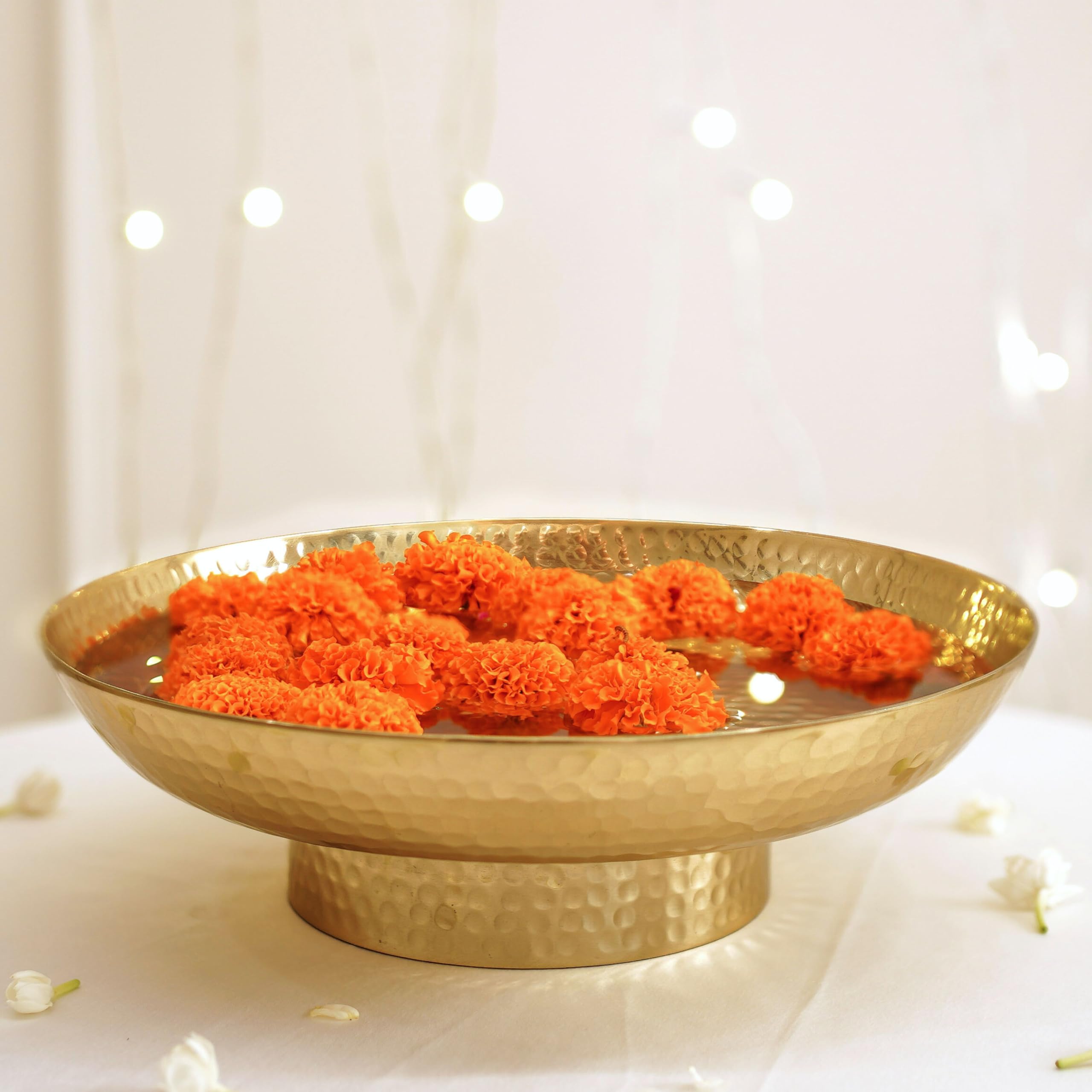 Decorate your home with hammered round metal urli bowl for decoration. Use this with other home decor items for a living room stylish. This urli bowl for home decor is perfect for your home entrance kitchen shelf coffee table dining bathroom any corner of your home. The tray is made of aluminum and is lightweight. It is sure to give your space a luxurious and traditional look. Fill this tray with water and decorate it with floating tea-light candles flower decorations and aroma oils for the perfect Diwali decor.