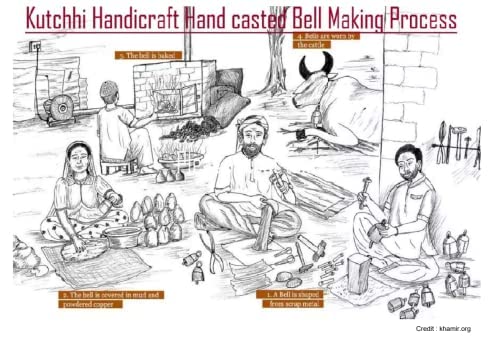 One of the 27 different traditional art forms of Kutch region of Gujarat. The artisans and the art is believed to have descended from Sindh in Pakistan centuries ago with Nomads migrating into Kutch region along with their cattle and art. Villages Kunaria Zura and Nirona in Kutch Gujarat are hub of this art and artisans. These bells are generally prepared from the scrap Iron or Tin thus this craft makes excellent utility and art from nothing through Creativity. Iron is cut and mould into cylindrical shape with hammering then upon hollow cylindrical shape crown is made and same is hammered with cylinder. Thus the bell is ready but it is hammered gently from various directions till bottom rim of the bell is so molded that it produces desired sound. This requires deeply trained ears and hands to mould the bell such as to produces sweet melodious sound . Once moulded bells are soaked in the liquid solution of brass and copper and wet bell is covered with Mud. Then the coated and mud covered bells are kept into the furnace for few hours to make bells alloyed with covered metals. Sesham ringer is then attached inside the bell as a ringer. The sound of Kutchhi Hand Crafted bell is very unique given the craft of moulding them in a such a manner. The sound of Handcasted bell can be easily differentiated from machine made bells and sound of none of the machine made bells can come parallel to the sweetness and depth of this Handcasted bell. Panchdhatu is also considered to be auspicious for the home from the view point of Vastu Shastra.