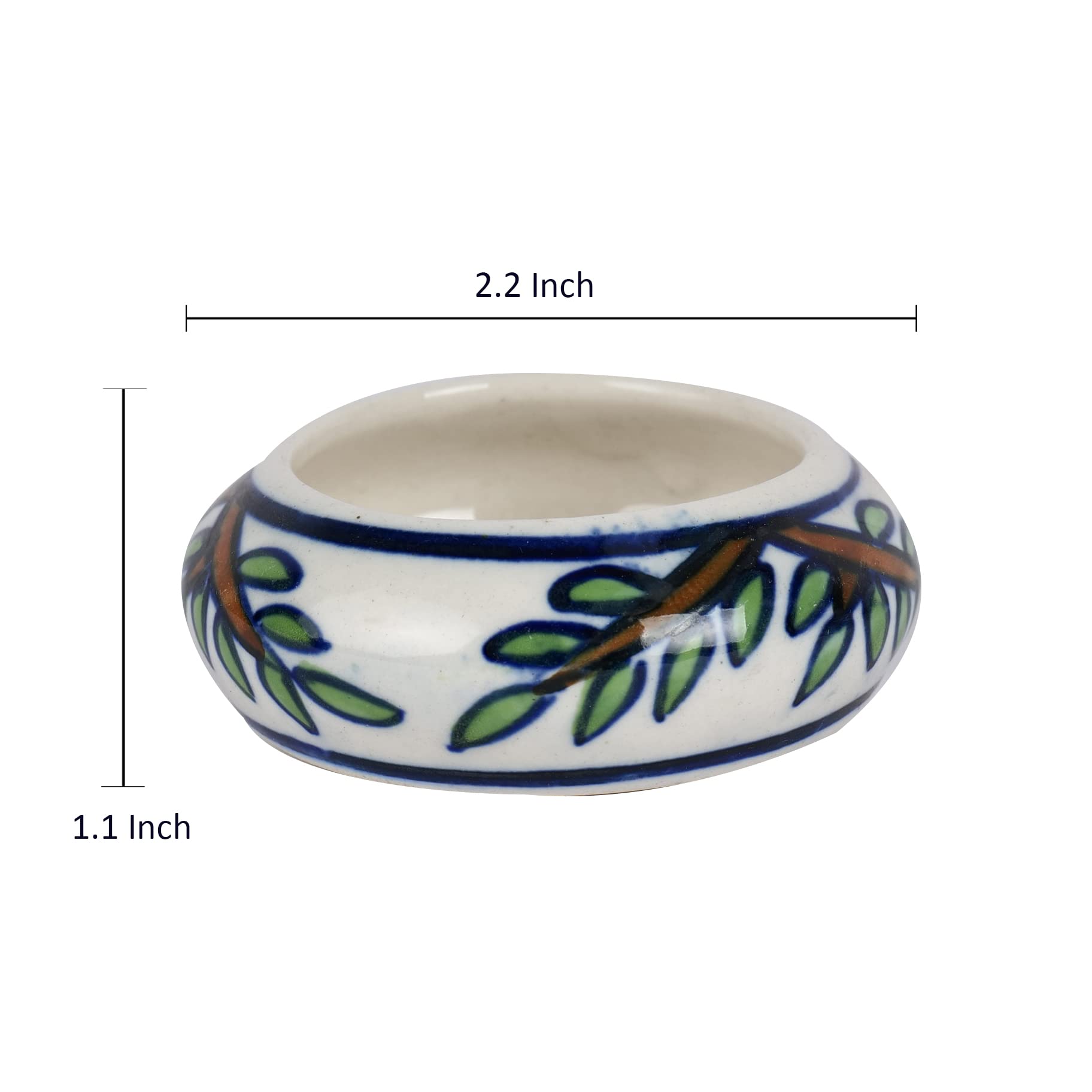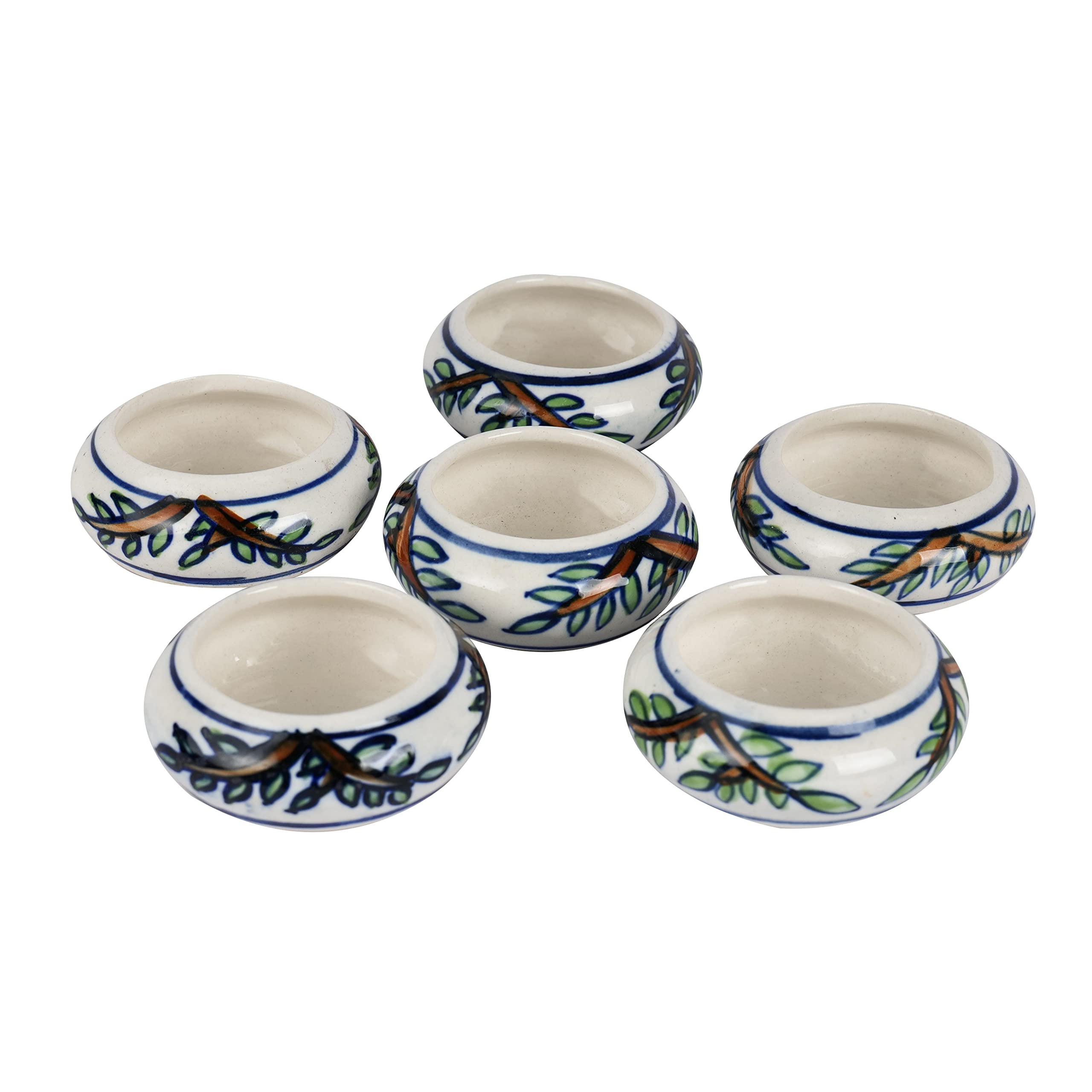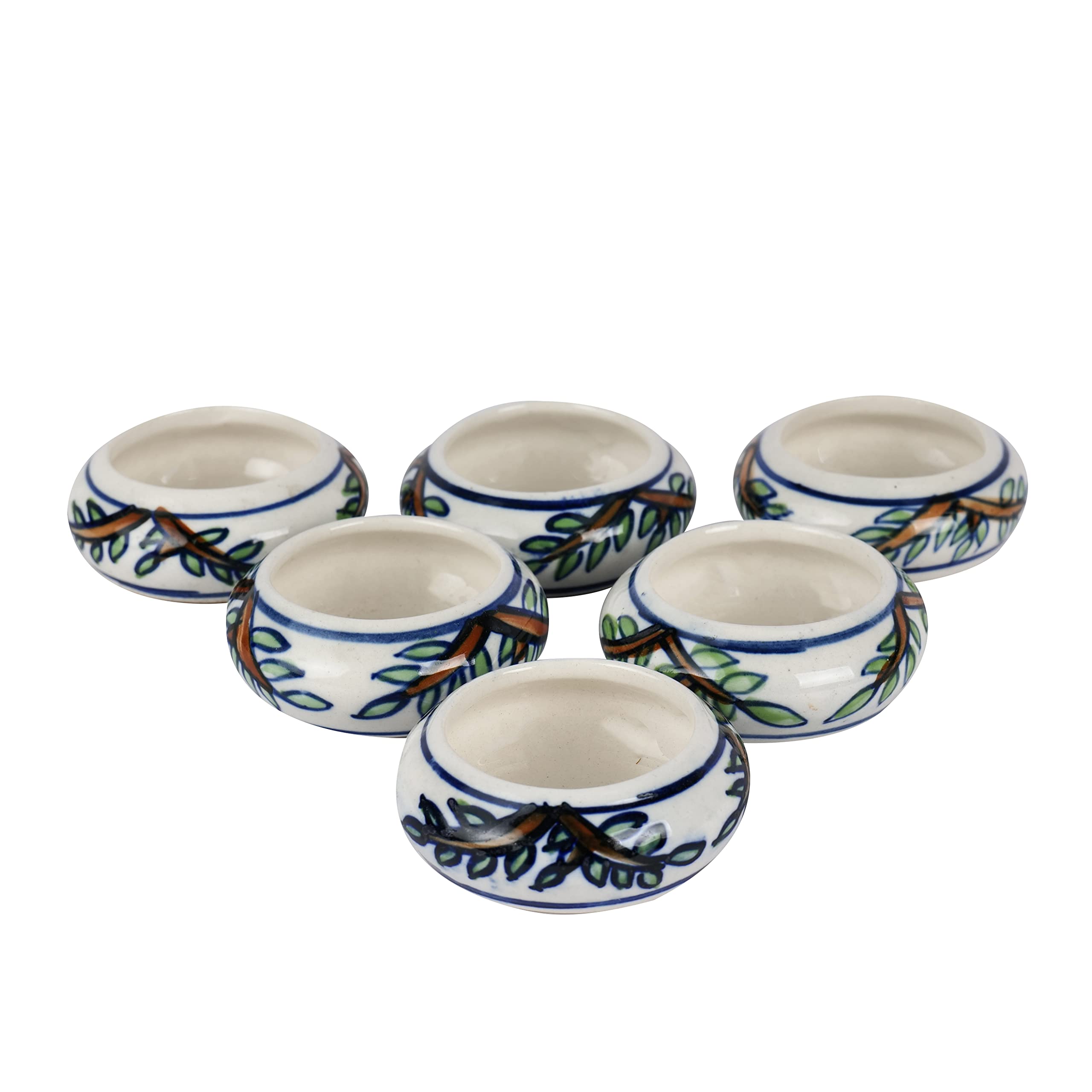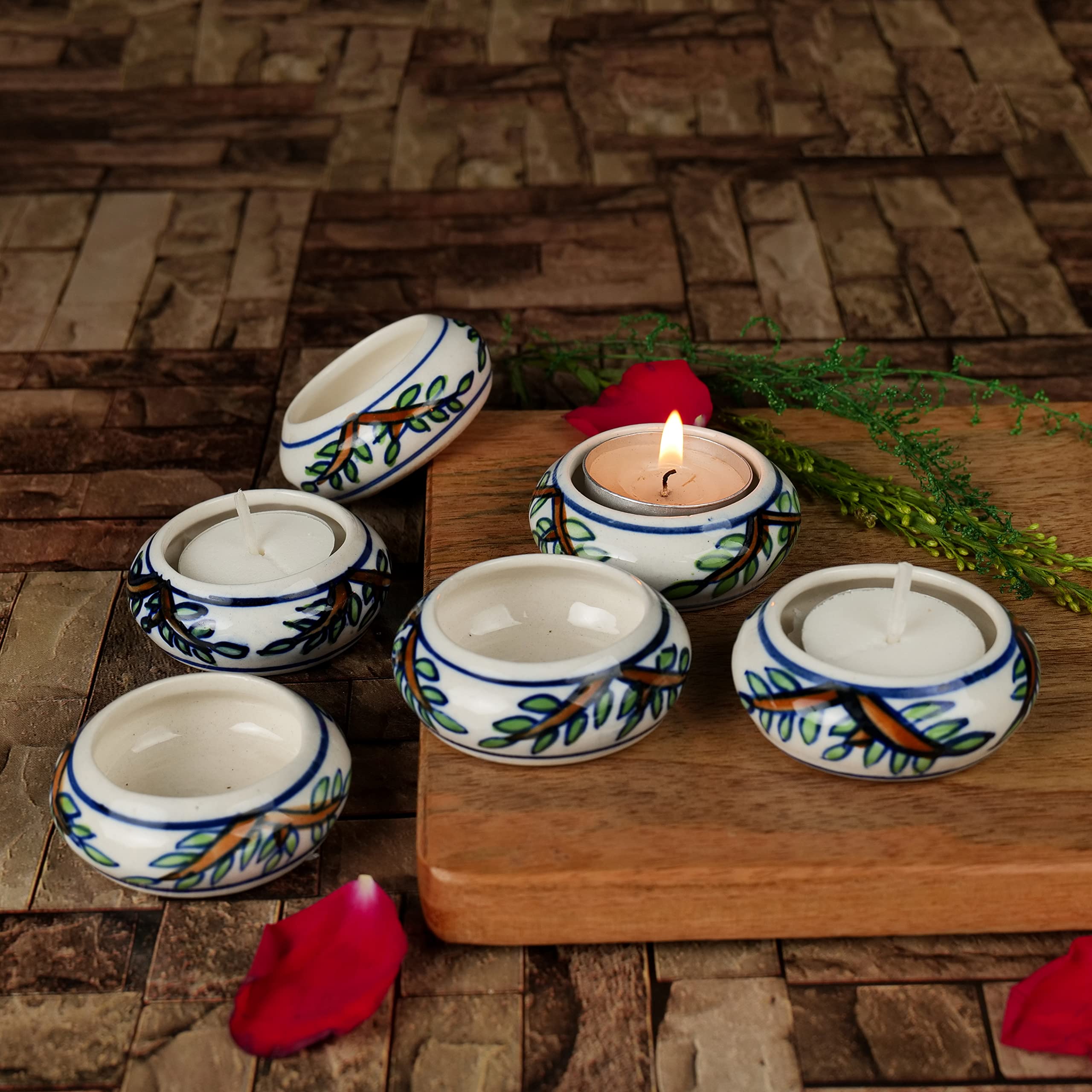 PRODUCT DESCRIPTION:Enlighten and beautify your surroundings on special events or on a regular basis with our specially hand-painted & exclusive Ceramic tealight holders that are available in a set of 6 for you. Perfect for Diwali these votives with supplementary tealight candles also make up for a great festive gift for your friends and family. These holders come in a white shade with a leafy pattern.FEATURES:Set of 6 Ceramic votives that are beautifully hand-painted depicting leafy patterns by our talented artists.Use them for home decoration pooja purpose warm & mild lighting special occasions & festivals such as Diwali etc.Each tealight holder comes with a tealight candle.Comes with a white background and makes for a great gifting option.NOTE:Please refer to the dimensions in the image.There may be a slight variation in the glazing color or finish of the tealight holders as the glazing is done inside the furnace at a very high temperature to make the product strong and sturdy.As the product is completely handcrafted & hand-painted there might be a slight difference in the shape & designs done on it.This product is not made of Bone China.CARE INSTRUCTIONS:Handle with care.Wipe it clean with a mildly wet cloth.Do not use any abrasive susbtances on this product.